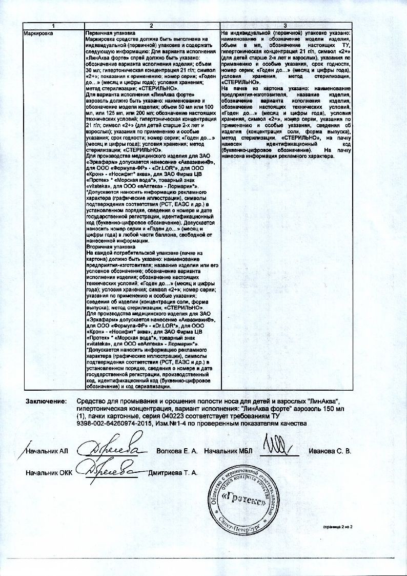 Средство для промывания и орошения полости носа «ЛинАква форте» (далее – Средство), прозрачная бесцветная жидкость без запаха со слабосоленым вкусом. Гипертоническая натуральная стерильная морская вода с содержанием натрия хлорида (NaCl) 21 г/л. Содержит все активные вещества и микроэлементы морской воды: К, Mg, Na, Са, Cl, Se, I, Zn, Cu, Fe и др. Не содержит консервантов.