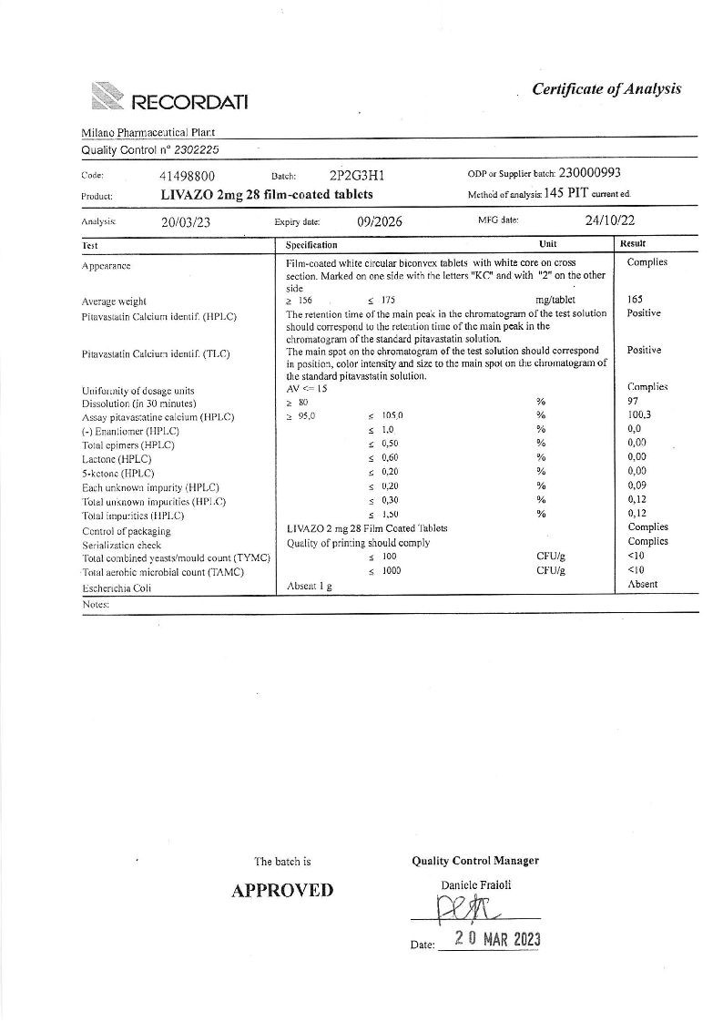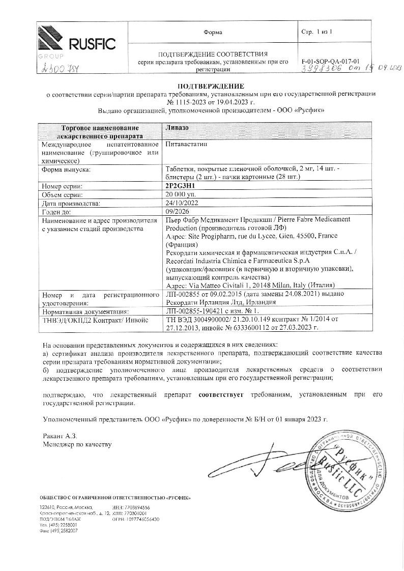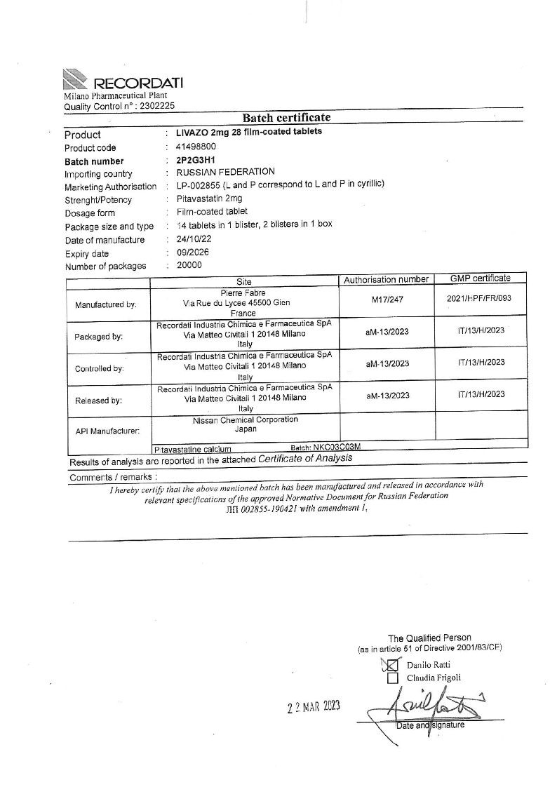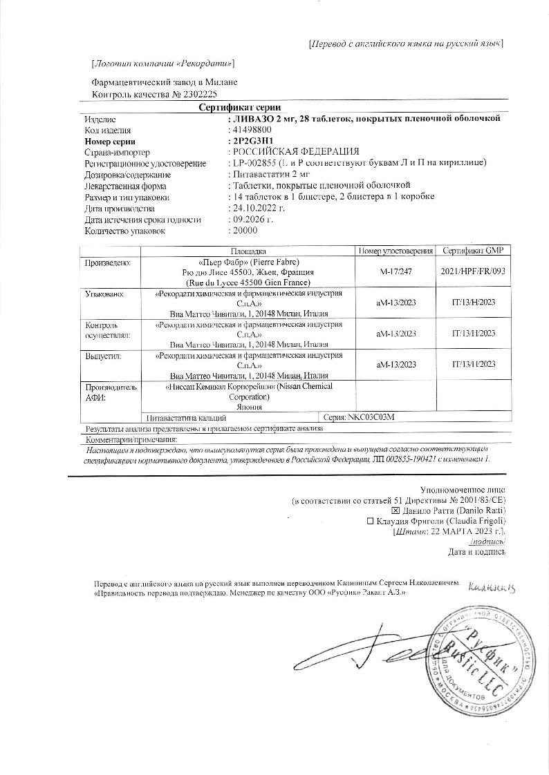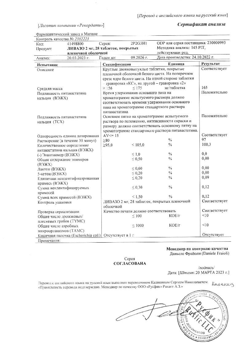 При лечении первичной гиперхолестеринемии и комбинированной (смешанной) дислипидемии при назначении в терапевтических дозах питавастатин достоверно снижал концентрацию ХС ЛПНП. ОХС, ХС не-ЛПВП, ТГ и Аро-В и повышал концентрацию ХС ЛПВП и Аро-А1. Уменьшалось соотношение ОХС/ХС ЛПВП и Аро-В/Аро-А1. При применении Ливазо в дозе 2 мг достигалось снижение концентрации ХС ЛПНП на 38-39%, и на 44-45% - при применении дозы 4 мг. В большинстве случаев при назначении дозы 2 мг достигался целевой показатель лечения ХС ЛПНП по рекомендациям Европейского общества атеросклероза (EAS).