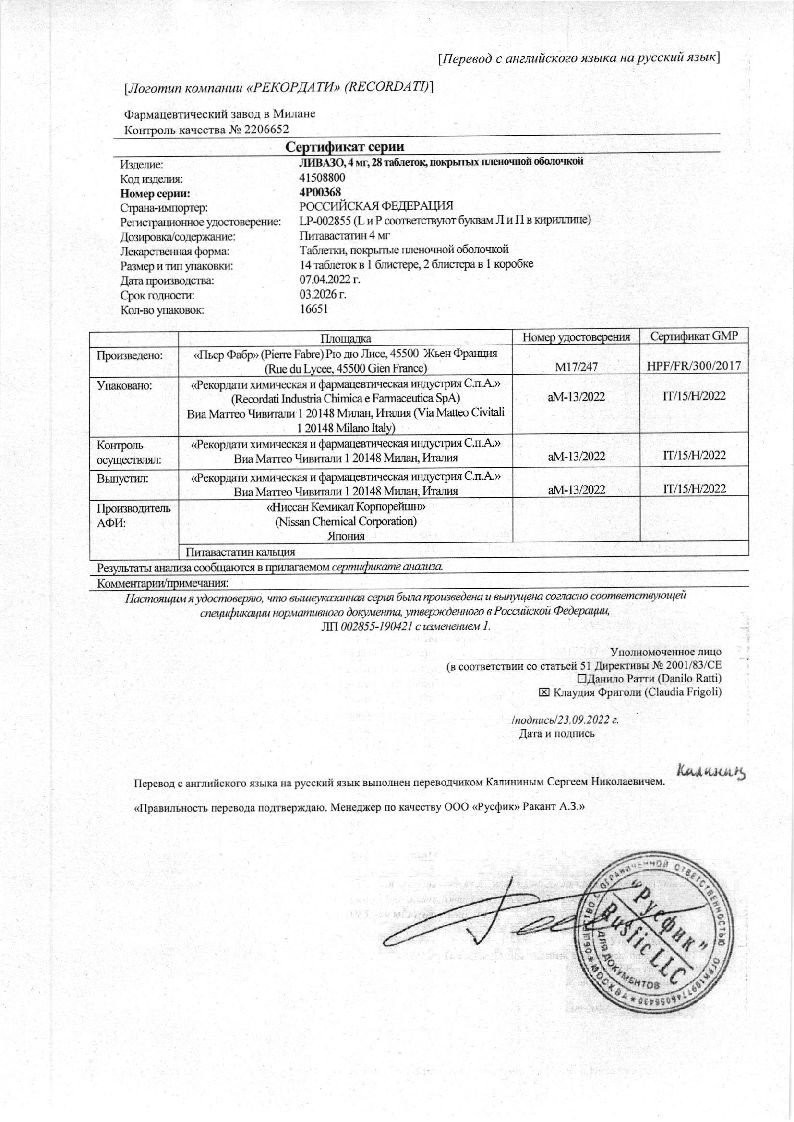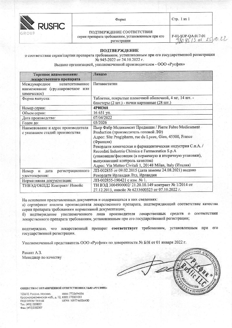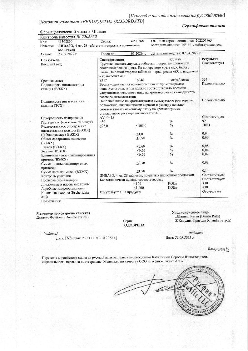 При лечении первичной гиперхолестеринемии и комбинированной (смешанной) дислипидемии при назначении в терапевтических дозах питавастатин достоверно снижал концентрацию ХС ЛПНП. ОХС, ХС не-ЛПВП, ТГ и Аро-В и повышал концентрацию ХС ЛПВП и Аро-А1. Уменьшалось соотношение ОХС/ХС ЛПВП и Аро-В/Аро-А1. При применении Ливазо в дозе 2 мг достигалось снижение концентрации ХС ЛПНП на 38-39%, и на 44-45% - при применении дозы 4 мг. В большинстве случаев при назначении дозы 2 мг достигался целевой показатель лечения ХС ЛПНП по рекомендациям Европейского общества атеросклероза (EAS).