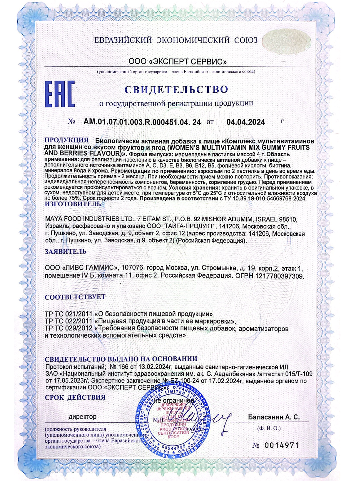 Вкусный витаминно-минеральный комплекс для женщин содержит незаменимые нутриенты для активации иммунитета, заряда бодрости и поддержания красоты. Проходит строжайший контроль качества и соответствует международным стандартам: FDA, GMP, ISO, HACCP.