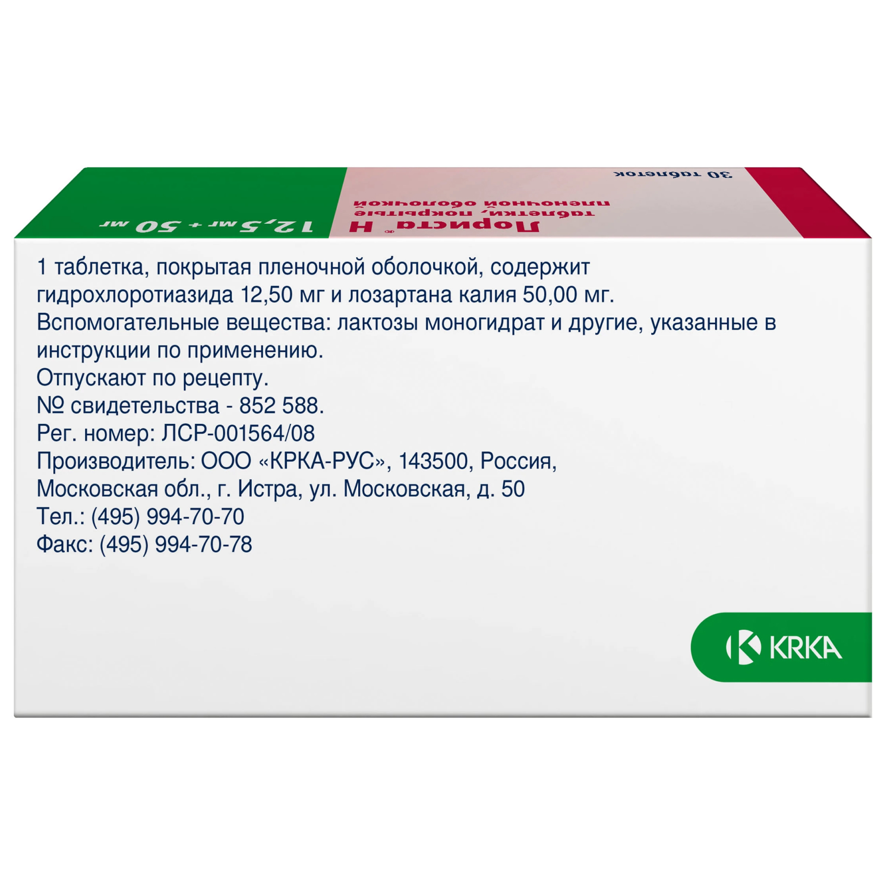 Действующие вещества: гидрохлоротиазид 12,50 мг, лозартан калия 50,00 мг,