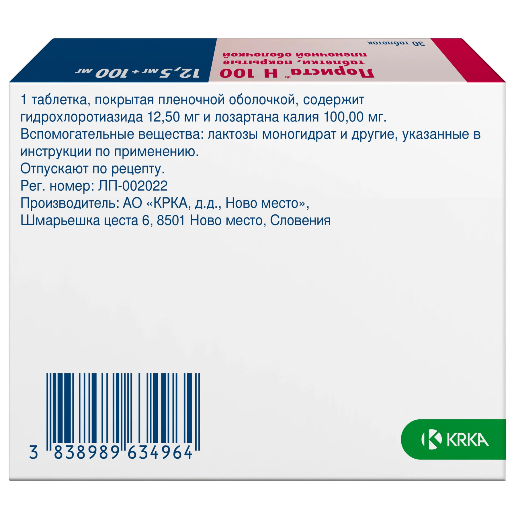 Активные вещества: лозартан калия 100 мг, гидрохлоротиазид 12.5 мг.