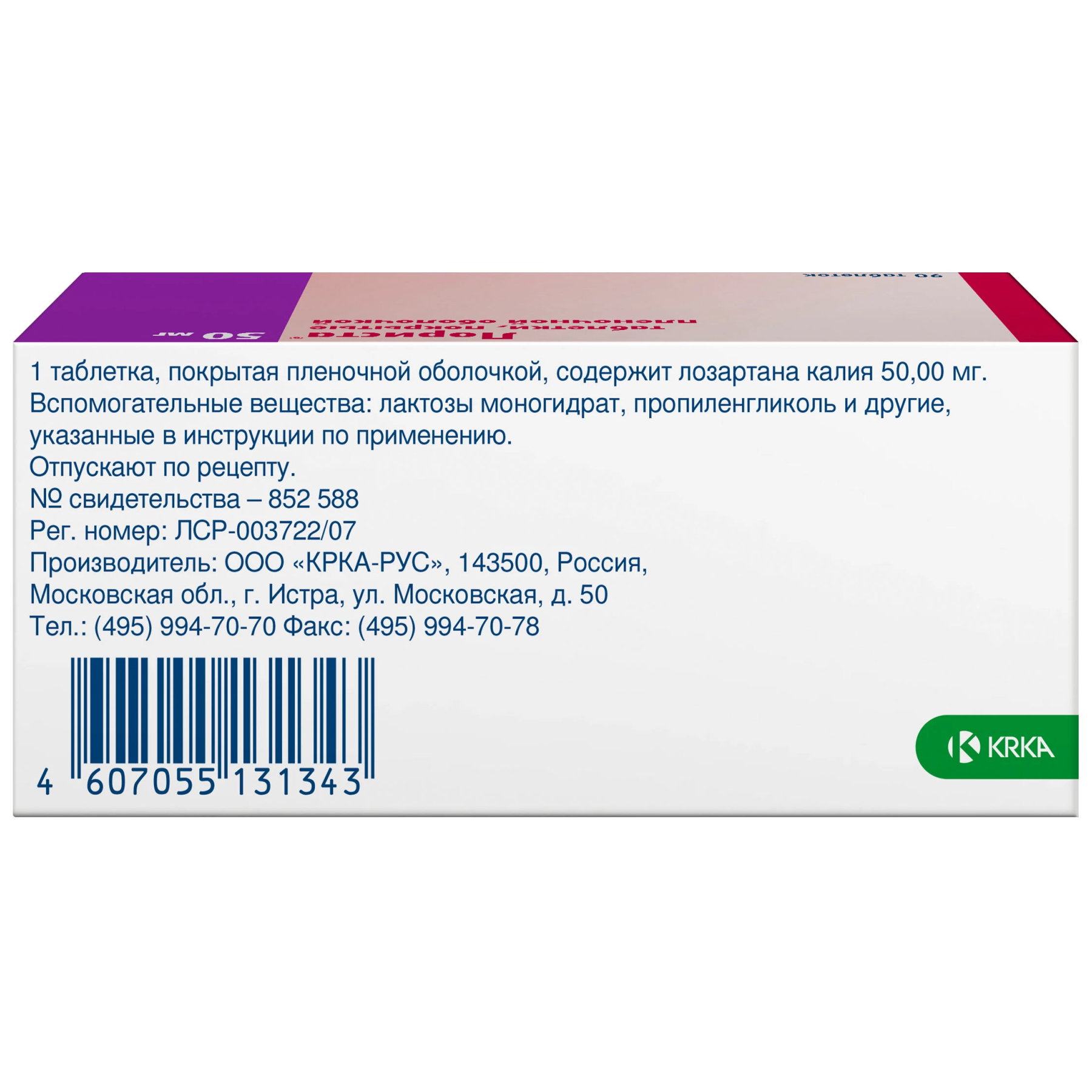 Действующее вещество: лозартан калия 50 мг.