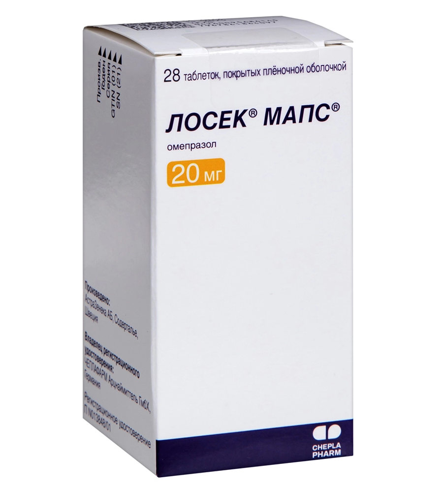 Двухкомпонентная схема лечения: Лосек МАПС 40–80 мг и амоксициллин 1,5 г ежедневно (дозу следует делить на части) в течение 2 нед. Во время клинических испытаний применяли Лосек МАПС 40 мг 1 раз в сутки, амоксициллин в суточной дозе 1,5–3 г и кларитромицин 500 мг 3 раза в сутки в течение 2 нед. Если после лечения проба на Helicobacter pylori остается положительной, курс можно повторить.