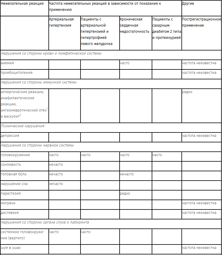 1 Включая ангионевротический отек гортани, глотки, лица, губ, глотки и/или языка (вызывающие обструкцию дыхательных путей); у некоторых из этих пациентов в анамнезе были указания на перенесенный ангионевротический отек при приеме других лекарственных средств, включая ингибиторы АПФ).