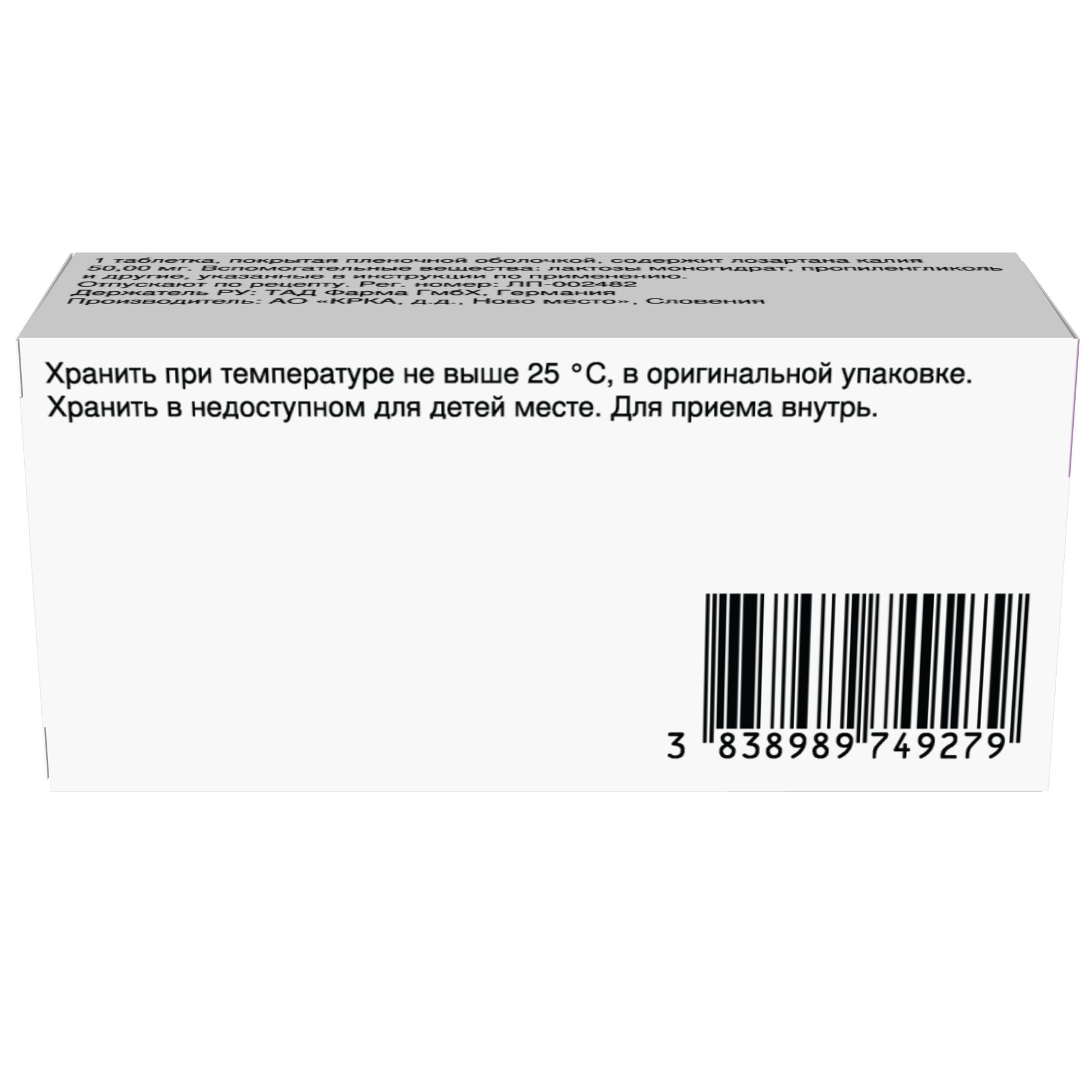 Действующее вещество: лозартан калия 50,00 мг.