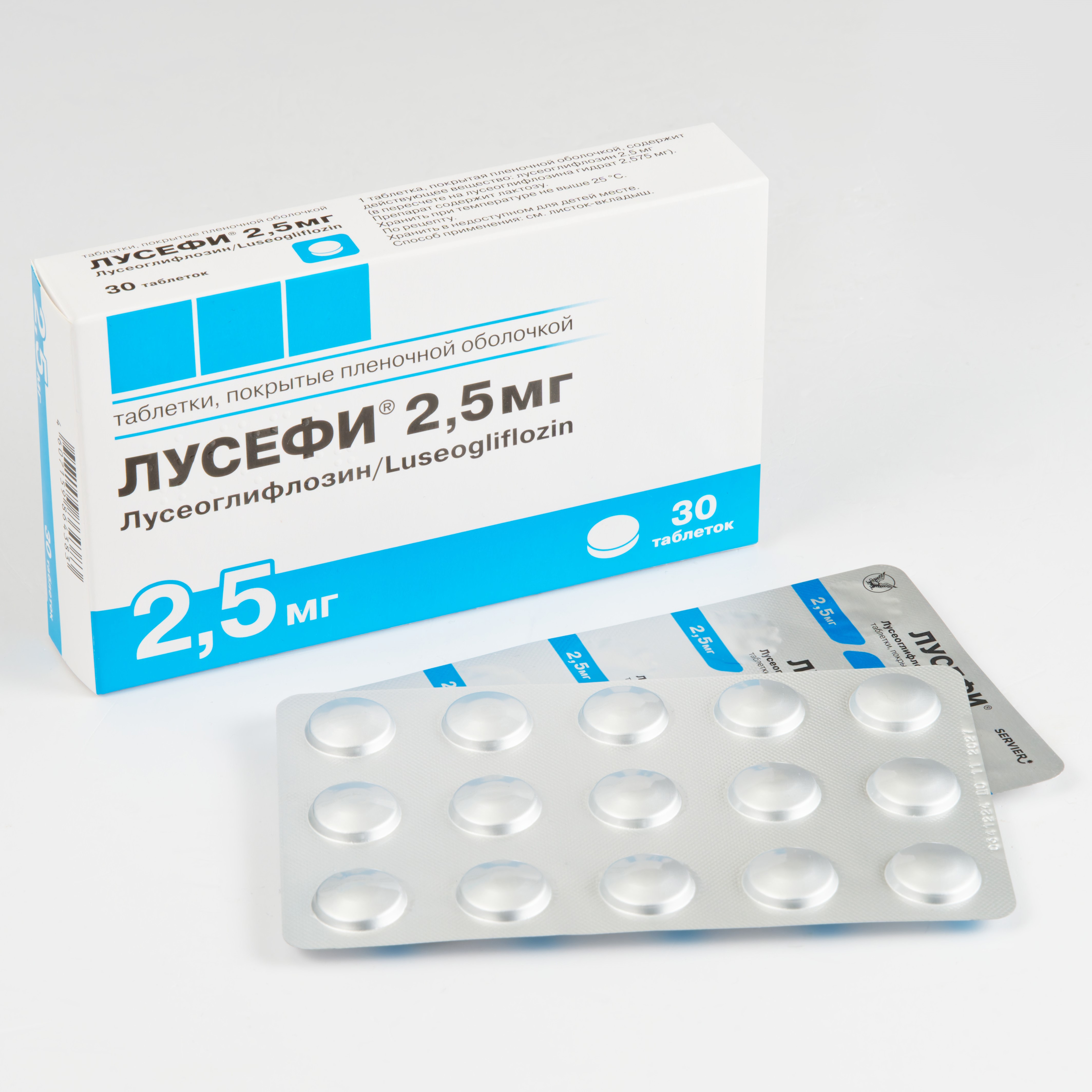 Каждая таблетка содержит 2,5 мг лусеоглифлозина (в виде гидрата).