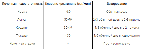 Пожилым больным доза корригируется при наличии почечной недостаточности и при длительной терапии необходим контроль функции почек.