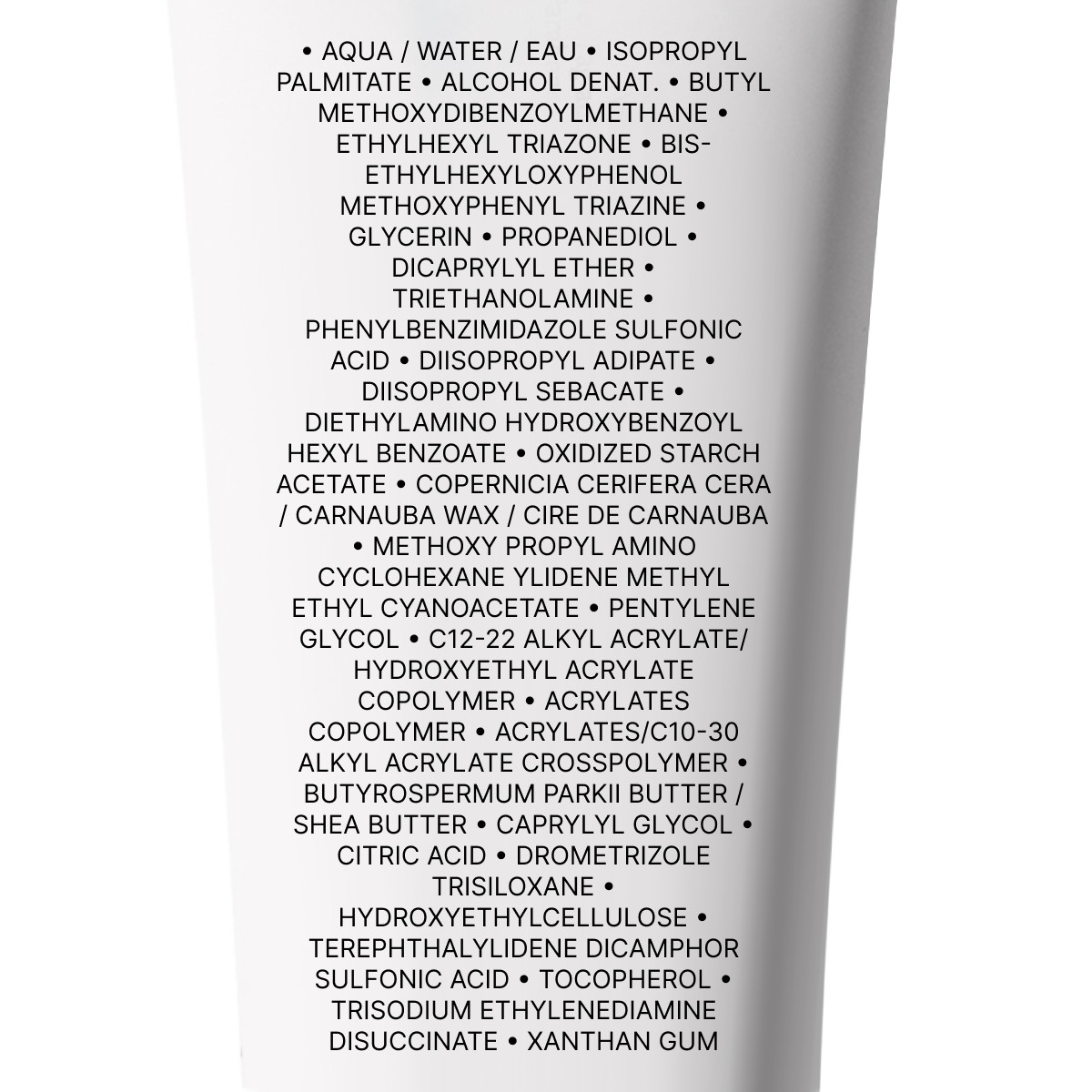 • AQUA / WATER / EAU • ISOPROPYL PALMITATE • ALCOHOL DENAT. • BUTYL METHOXYDIBENZOYLMETHANE • ETHYLHEXYL TRIAZONE • BIS-ETHYLHEXYLOXYPHENOL METHOXYPHENYL TRIAZINE • GLYCERIN • PROPANEDIOL • DICAPRYLYL ETHER • TRIETHANOLAMINE • PHENYLBENZIMIDAZOLE SULFONIC ACID • DIISOPROPYL ADIPATE • DIISOPROPYL SEBACATE • DIETHYLAMINO HYDROXYBENZOYL HEXYL BENZOATE • OXIDIZED STARCH ACETATE • COPERNICIA CERIFERA CERA / CARNAUBA WAX / CIRE DE CARNAUBA • METHOXY PROPYL AMINO CYCLOHEXANE YLIDENE METHYL ETHYL CYANOACETATE • PENTYLENE GLYCOL • C12-22 ALKYL ACRYLATE/HYDROXYETHYL ACRYLATE COPOLYMER • ACRYLATES COPOLYMER • ACRYLATES/C10-30 ALKYL ACRYLATE CROSSPOLYMER • BUTYROSPERMUM PARKII BUTTER / SHEA BUTTER • CAPRYLYL GLYCOL • CITRIC ACID • DROMETRIZOLE TRISILOXANE • HYDROXYETHYLCELLULOSE • TEREPHTHALYLIDENE DICAMPHOR SULFONIC ACID • TOCOPHEROL • TRISODIUM ETHYLENEDIAMINE DISUCCINATE • XANTHAN GUM.
