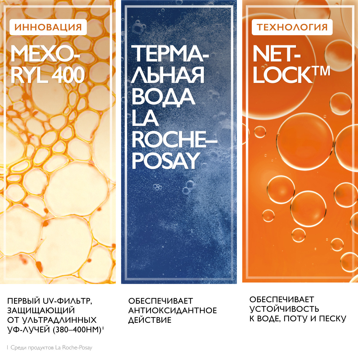 Защита от широкого спектра УФ-лучей: UVB-, UVA- и ультрадлинных UVA-лучей. Инновационный1 UV-фильтр Mexoryl 400 защищает от ультрадлинных UVA-лучей (380-400 нм) которые незаметны, повреждают кожу на глубоком клеточном уровне и составляют 30% УФ-лучей, воздействующих на кожу круглый год.