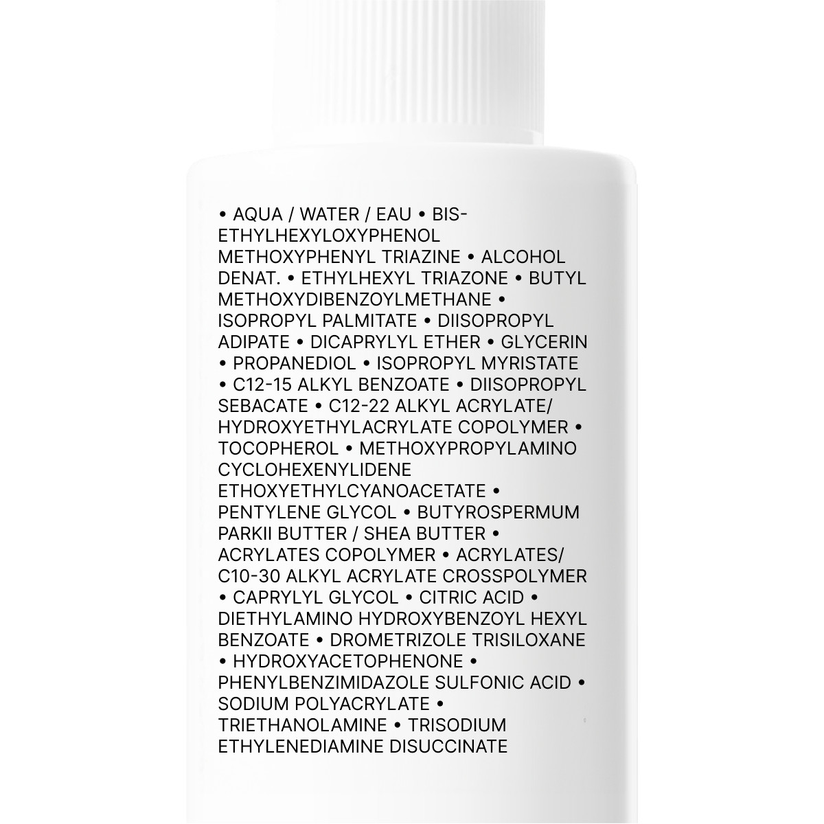 Аqua, bis-ethylhexyloxyphenol methoxyphenyl triazine, alcohol denat., ethylhexyl triazone, butyl methoxydibenzoylmethane, isopropyl palmitate, diisopropyl adipate, dicaprylyl ether, glycerin, propanediol, isopropyl myristate, c12-15 alkyl benzoate, diisopropyl sebacate, c12-22 alkyl acrylate/hydroxyethylacrylate copolymer, tocopherol, methoxypropylamino cyclohexenylidene ethoxyethylcyanoacetate, pentylene glycol, butyrospermum parkii butter / shea butter, acrylates copolymer, acrylates/c10-30 alkyl acrylate crosspolymer, caprylyl glycol, citric acid, diethylamino hydroxybenzoyl hexyl benzoate, drometrizole trisiloxane, hydroxyacetophenone, phenylbenzimidazole sulfonic acid, sodium polyacrylate, triethanolamine, trisodium ethylenediamine disuccinate.