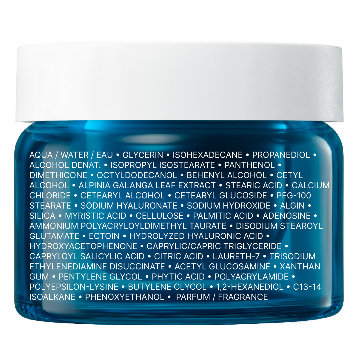 AQUA / WATER / EAU • GLYCERIN • ISOHEXADECANE • PROPANEDIOL • ALCOHOL DENAT • ISOPROPYL ISOSTEARATE • PANTHENOL • DIMETHICONE • OCTYLDODECANOL • BEHENYL ALCOHOL • CETYL ALCOHOL • ALPINIA GALANGA LEAF EXTRACT • STEARIC ACID • CALCIUM CHLORIDE • CETEARYL ALCOHOL • CETEARYL GLUCOSIDE • PEG-100 STEARATE • SODIUM HYALURONATE • SODIUM HYDROXIDE • ALGIN • SILICA • MYRISTIC ACID • CELLULOSE • PALMITIC ACID • ADENOSINE • AMMONIUM POLYACRYLOYLDIMETHYL TAURATE • DISODIUM STEAROYL GLUTAMATE • ECTOIN • HYDROLYZED HYALURONIC ACID • HYDROXYACETOPHENONE • CAPRYLIC/CAPRIC TRIGLYCERIDE • CAPRYLOYL SALICYLIC ACID • CITRIC ACID • LAURETH-7 • TRISODIUM ETHYLENEDIAMINE DISUCCINATE • ACETYL GLUCOSAMINE • XANTHAN GUM • PENTYLENE GLYCOL • PHYTIC ACID • POLYACRYLAMIDE • POLYEPSILON-LYSINE • BUTYLENE GLYCOL • 1,2-HEXANEDIOL • C13-14 ISOALKANE • PHENOXYETHANOL • PARFUM / FRAGRANCE.