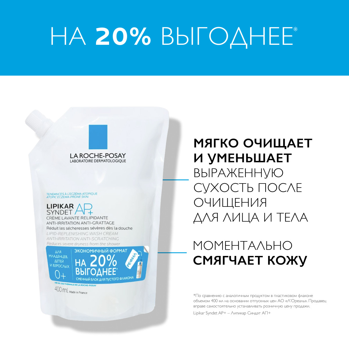 Сменный блок (рефилл) Липидовосстанавливающий очищающий крем-гель для лица и тела Lipikar Syndet AP+ (400 мл) бережно очищает женскую, мужскую и детскую кожу, подходит для мытья, купания и подмывания новорожденных младенцев с первых дней жизни.
