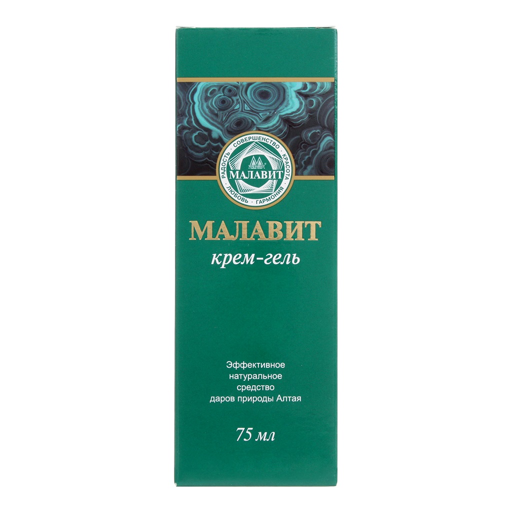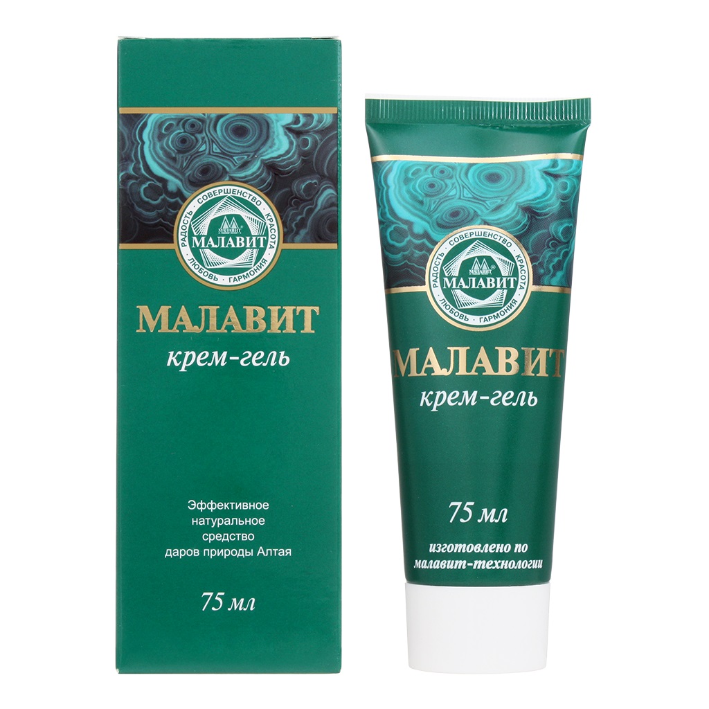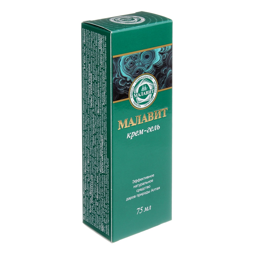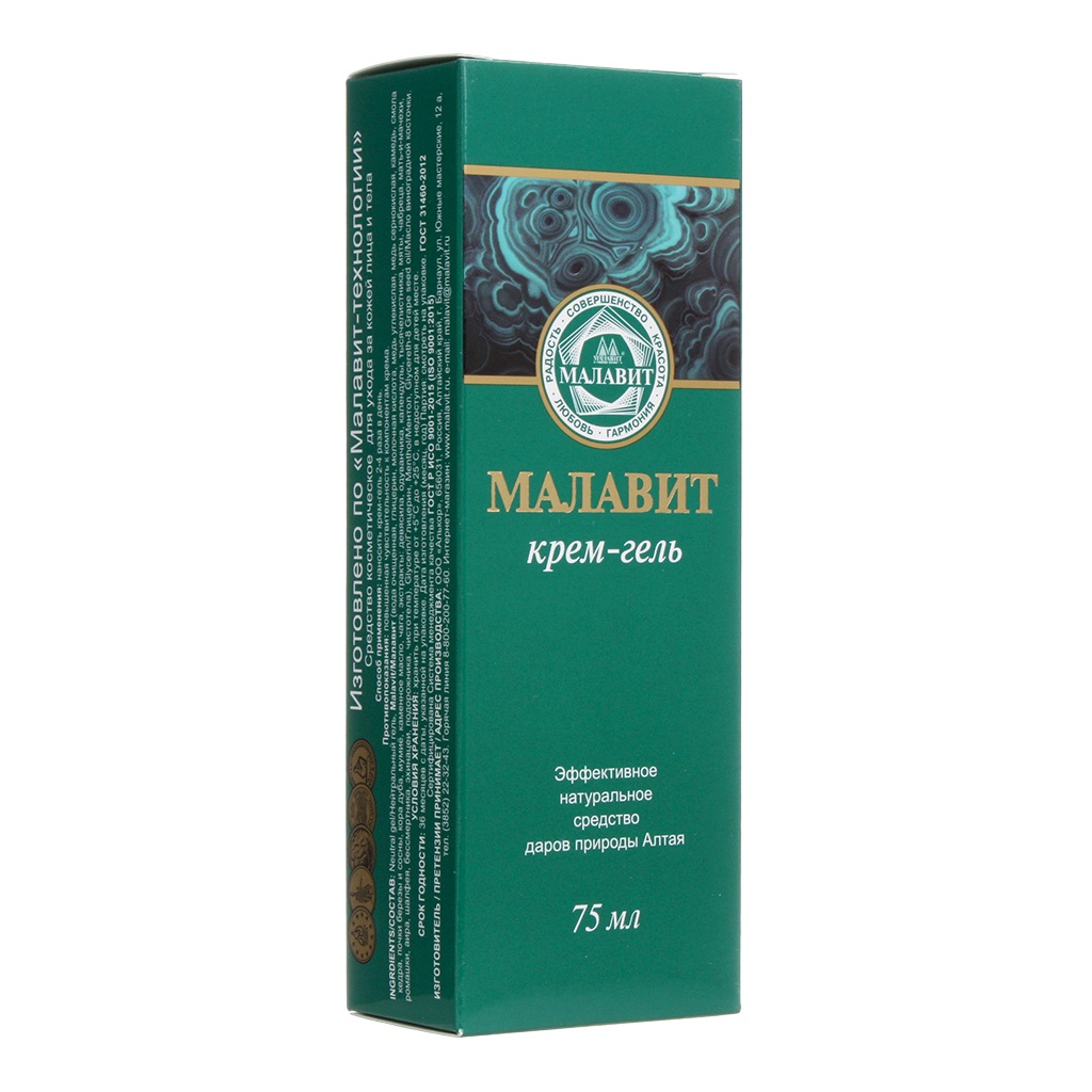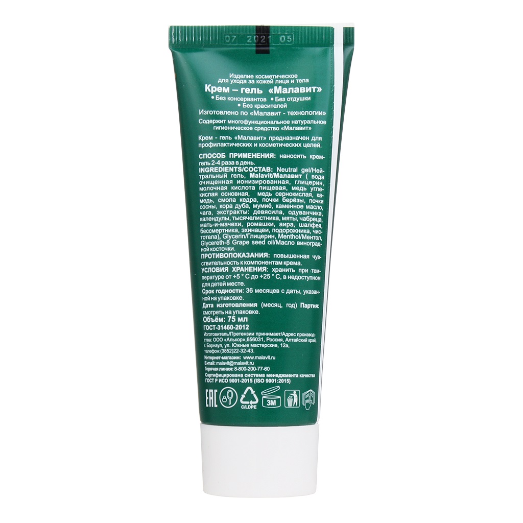 Основное действующее вещество крем-геля - высокоэффективное натуральное многофункциональное гигиеническое и косметическое средство "Малавит" (вода очищенная, глицерин, молочная кислота пищевая, медь углекислая основная, медь сернокислая, камедь, смола кедра, почки березы и сосны, кора дуба, мумие, каменное масло, чага, экстракты целебных растений (девясила высокого, одуванчика лекарственного, календулы лекарственной, тысячелистника обыкновенного, мяты перечной, чабреца, мать-и-мачехи, ромашки аптечной, аира болотного, шалфея лекарственного, бессмертника песчаного, эхинацеи, подорожника, чистотела).