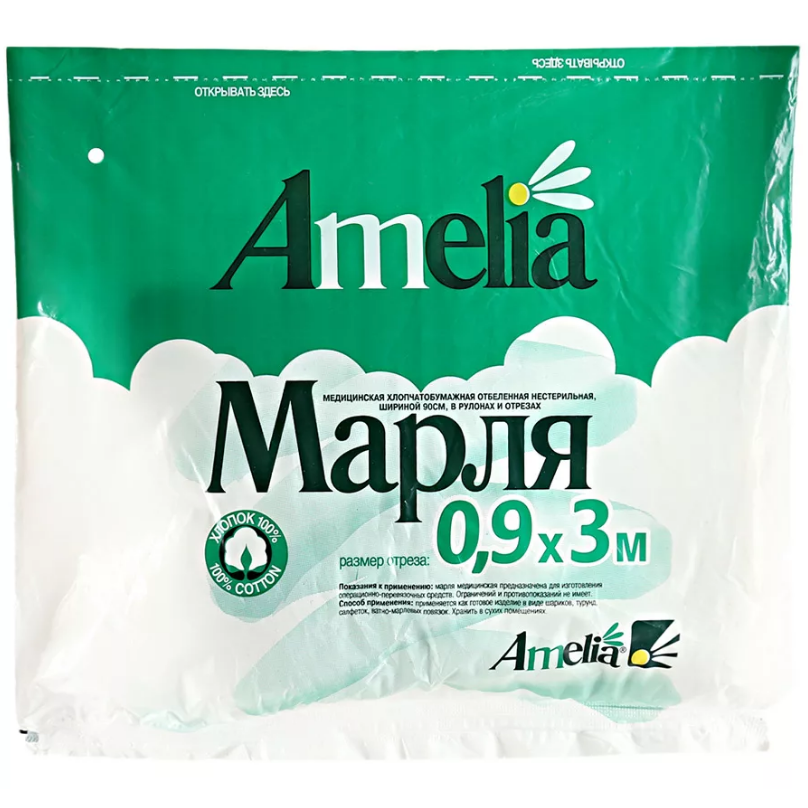 Отрезы марлевые медицинские Амелия изготовлены из качественной марли повышенной плотности в строгом соответствии с ГОСТ 9412-93. Марля обладает высокой прочностью и гигроскопичностью. Для упаковки марлевых отрезов используется высококачественный полиэтиленовый пакет, имеющий перфорацию для удобства открывания.