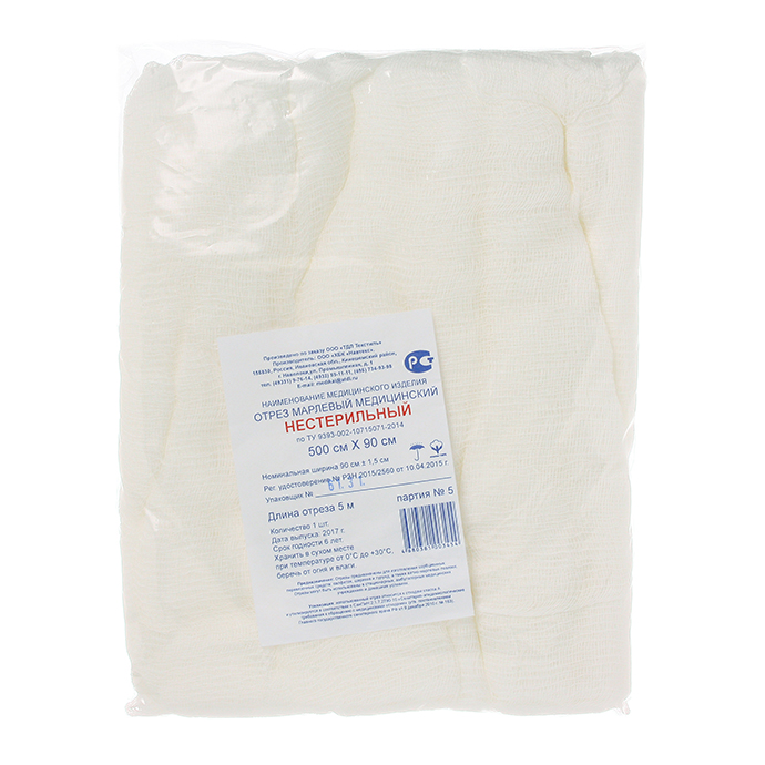 Марлевый отрез медицинский изготовлен из медицинской марли простого плетения. Отрез упакован в полиэтиленовую упаковку, которая служит защитой от пыли и влаги. Отрез марлевый удобен для выполнения повязок с использованием нестерильного бинта.