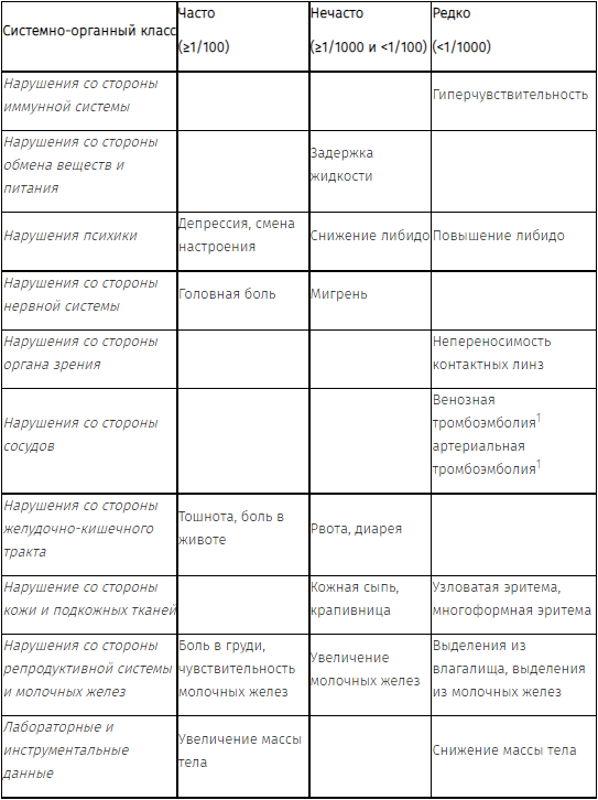 Побочные эффекты, которые отмечались у женщин при приеме КОК, подробно описаны в разделе "Особые указания" и включают: венозные и артериальные тромбоэмболии, повышение артериального давления, гормонозависимые опухоли (например, опухоли печени, рак молочной железы), хлоазму.