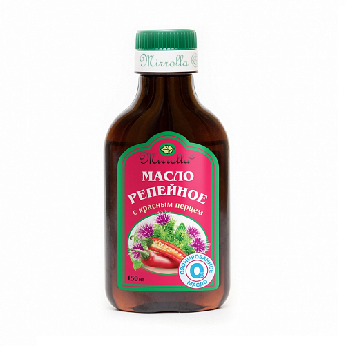 Репейное масло – активное средство для ухода за кожей головы и волосами всех типов. Масло содержит природный инулин, богатый комплекс витаминов, протеины, жирные кислоты, дубильные вещества и минеральные соли. Перец красный (жгучий) усиливает микроциркуляцию, способствуя быстрой доставке полезных компонентов репейника непосредственно к волосяным луковицам. Укрепляет корни волос, стимулирует их рост, насыщает витаминами, препятствует выпадению волос. Благодаря обогащению масла озоном улучшаются его свойства, направленные на восстановление полотна волос.