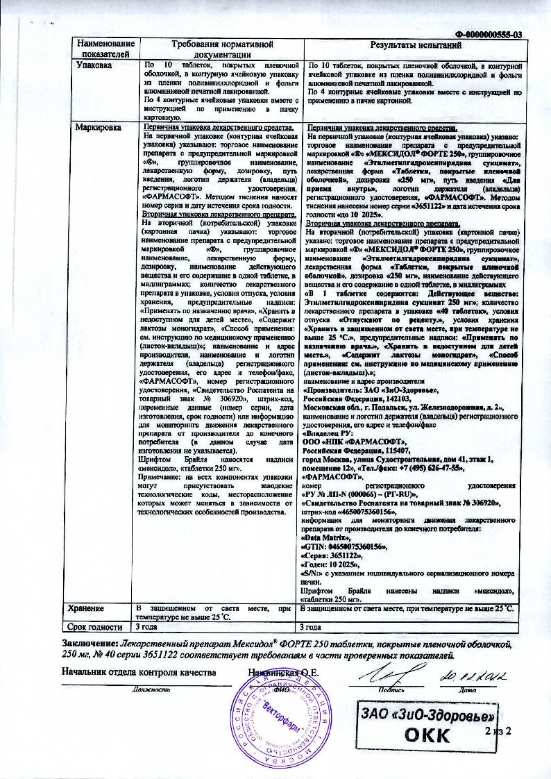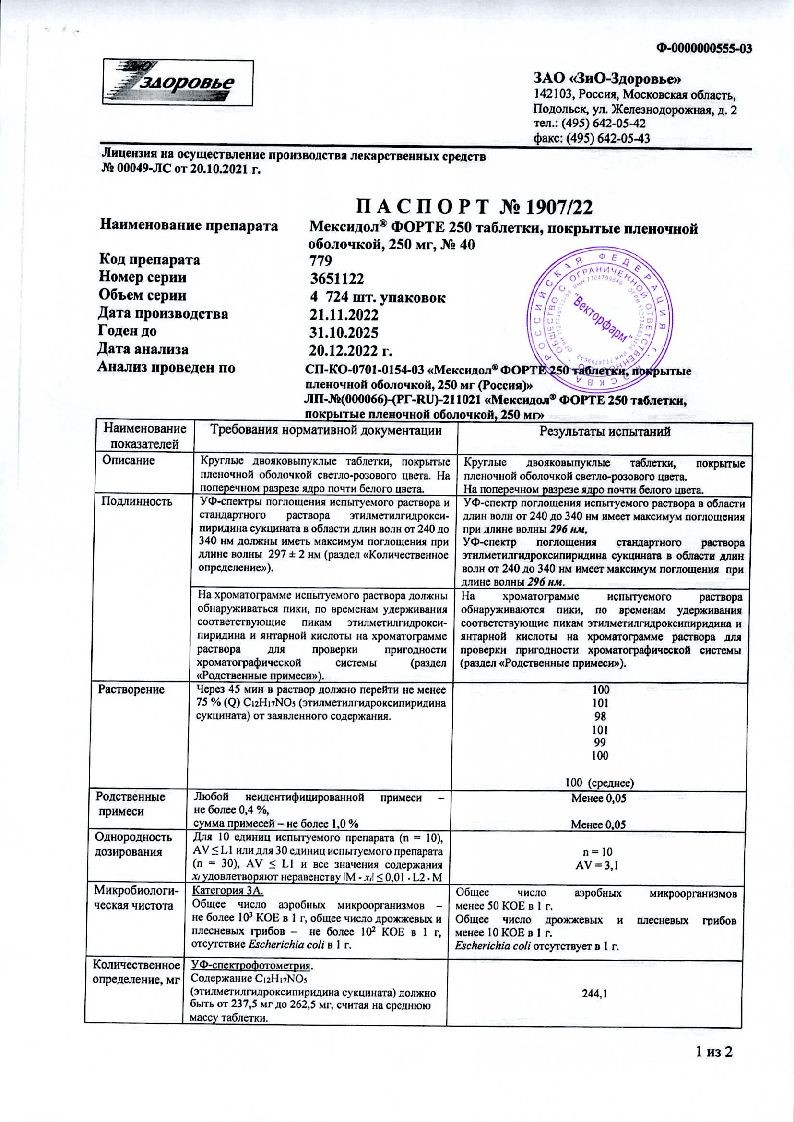 Действующим веществом препарата Мексидол® ФОРТЕ 250 является этилметилгидроксипиридина сукцинат. 1 таблетка содержит 250,0 мг этилметилгидроксипиридина сукцината.