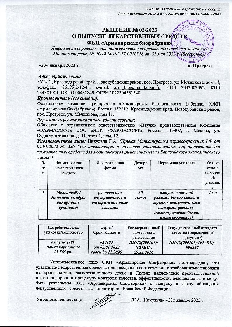 Каждый 1 мл раствора содержит 50 мг этилметилгидроксипиридина сукцината.