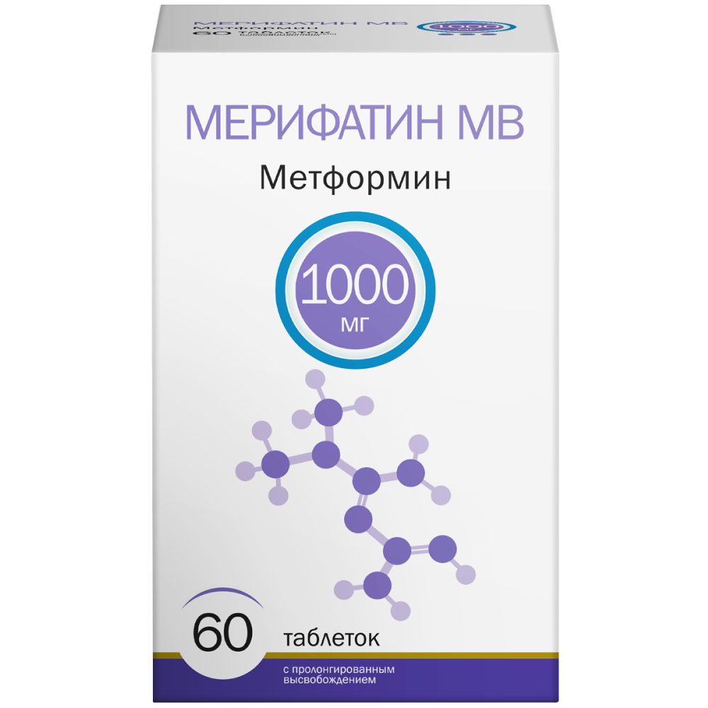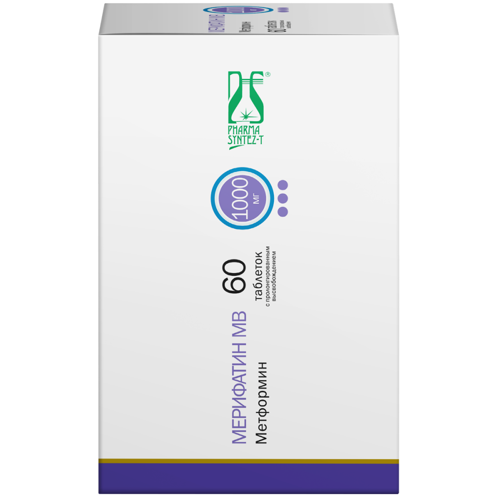 - Препарат Мерифатин МВ в дозе 1000 мг назначают в качестве поддерживающей терапии пациентам, принимающим метформин с обычным высвобождением в дозе 1000 мг или 2000 мг. Для перехода на препарат Мерифатин МВ в дозе 1000 мг суточная доза метформина должна быть эквивалентна суточной дозе метформина с обычным высвобождением;