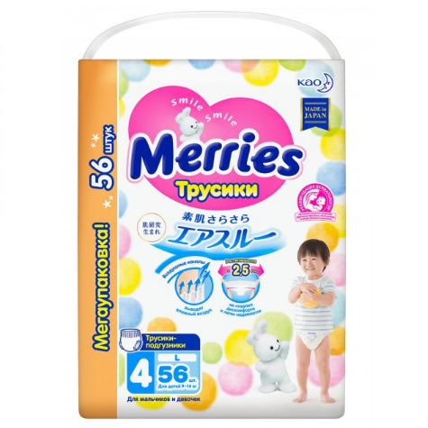 Merries Трусики-подгузники L (9-14 кг) 56 шт. идеально подойдут малышу, который начинает активно двигаться. Даже если малыш очень активный, трусики-подгузники Merries надежно защищают от протеканий и опрелостей, обеспечивая необходимый комфорт и свободу движений!