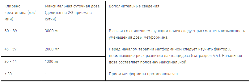 Метформин может применяться у пациентов с почечной недостаточностью средней степени тяжести с клиренсом креатинина (КК) 30 - 59 мл/мин только в случае отсутствия состояний/факторов риска, которые могут увеличивать риск развития лактоацидоза. Функция почек (КК) должна оцениваться до начала терапии метформином, а затем не реже 1 раза в год. У пациентов с повышенным риском прогрессирования почечной недостаточности и у пожилых людей функцию почек следует контролировать чаще (каждые 3 - 6 месяцев).