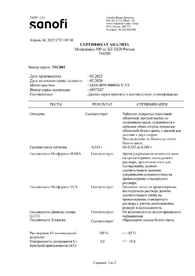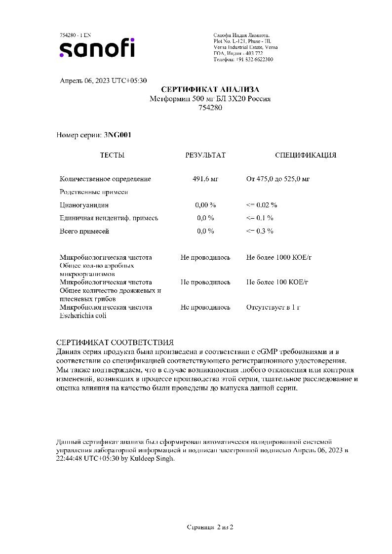 Действующее вещество: метформина гидрохлорид - 500 мг;