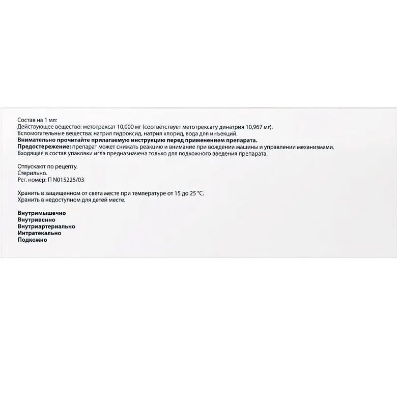 При в/м введении Cmax метотрексата в плазме крови достигается через 30-60 мин. Системная абсорбция метотрексата после введения под кожу живота и бедра одинакова. После в/в введения быстро распределяется в пределах объема, эквивалентного общему объему жидкостей организма. Первоначальный Vd - 0.18 л/кг (18% массы тела), равновесный объем распределения составляет 0.4-0.8 л/кг (40-80% массы тела). 50-60 % циркулирующего в сосудистом русле метотрексата связано с белками (главным образом с альбумином). Возможно конкурентное вытеснение при одновременном применении с сульфаниламидами, салицилатами, тетрациклинами, хлорамфениколами, фенитоином. Метотрексат не проникает через ГЭБ при применении в терапевтических дозах. Высокая концентрация метотрексата в ЦНС может быть достигнута при интратекальном введении. Метотрексат подвергается печеночному и внутриклеточному метаболизму с образованием фармакологически активной полиглутаминовой формы, также ингибирующей дигидрофолатредуктазу и синтез тимидина. Небольшое количество полиглутамат метотрексата может оставаться в тканях в течение длительного периода времени. Сохранение и пролонгирование действия активных метаболитов метотрексата различаются в зависимости от типа клеток, тканей и опухолей. Средние значения T1/2 при применении метотрексата в дозе менее 30 мг/м2 составляют 6-7 ч. У пациентов, получающих высокие дозы метотрексата, T1/2 составляет 8-17 ч. При хронической почечной недостаточности обе фазы выведения метотрексата могут быть значительно пролонгированы. Выводится преимущественно почками в неизмененном виде путем клубочковой фильтрации и канальцевой секреции (при в/в введении 80-90% выводится в течение 24 ч), с желчью выводится до 10% (с последующей реабсорбцией в кишечнике). Метотрексат кумулирует в печени, почках и органах в течение нескольких недель или месяцев. При повторных введениях накапливается в тканях в виде полиглутаматов.
