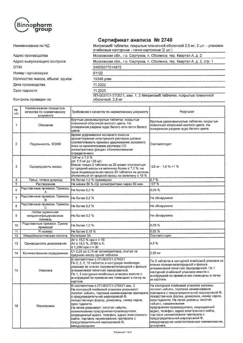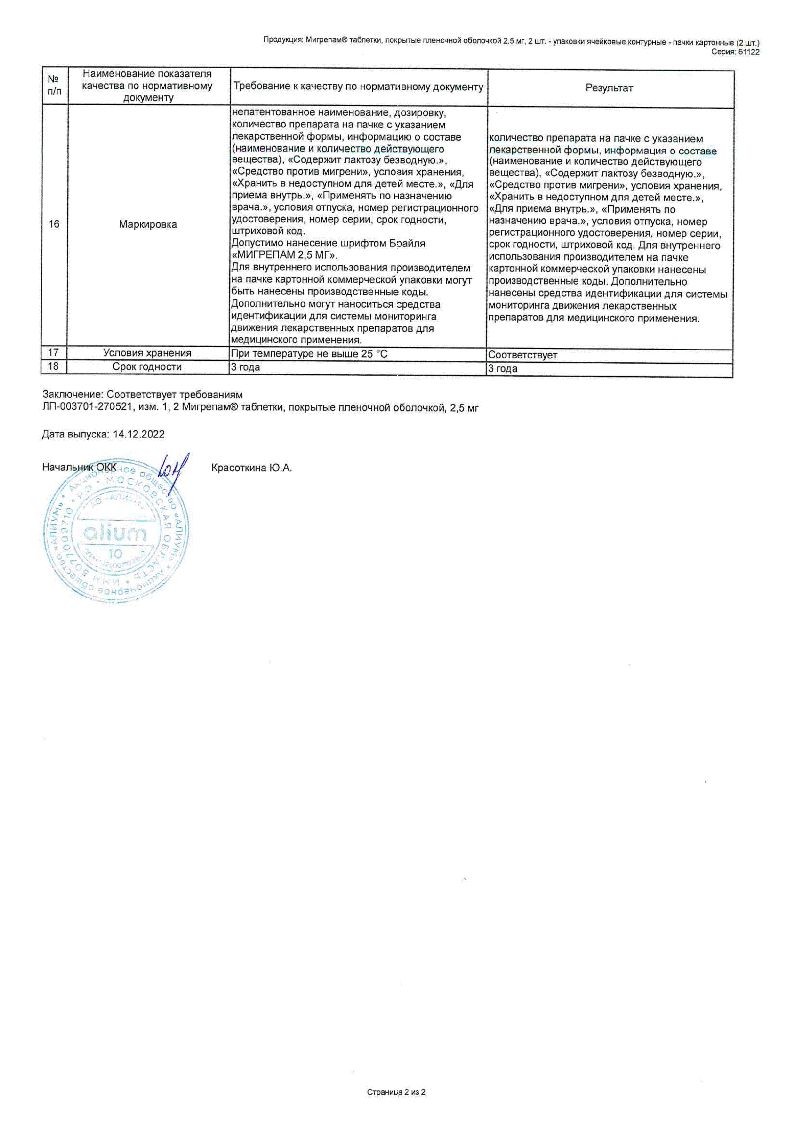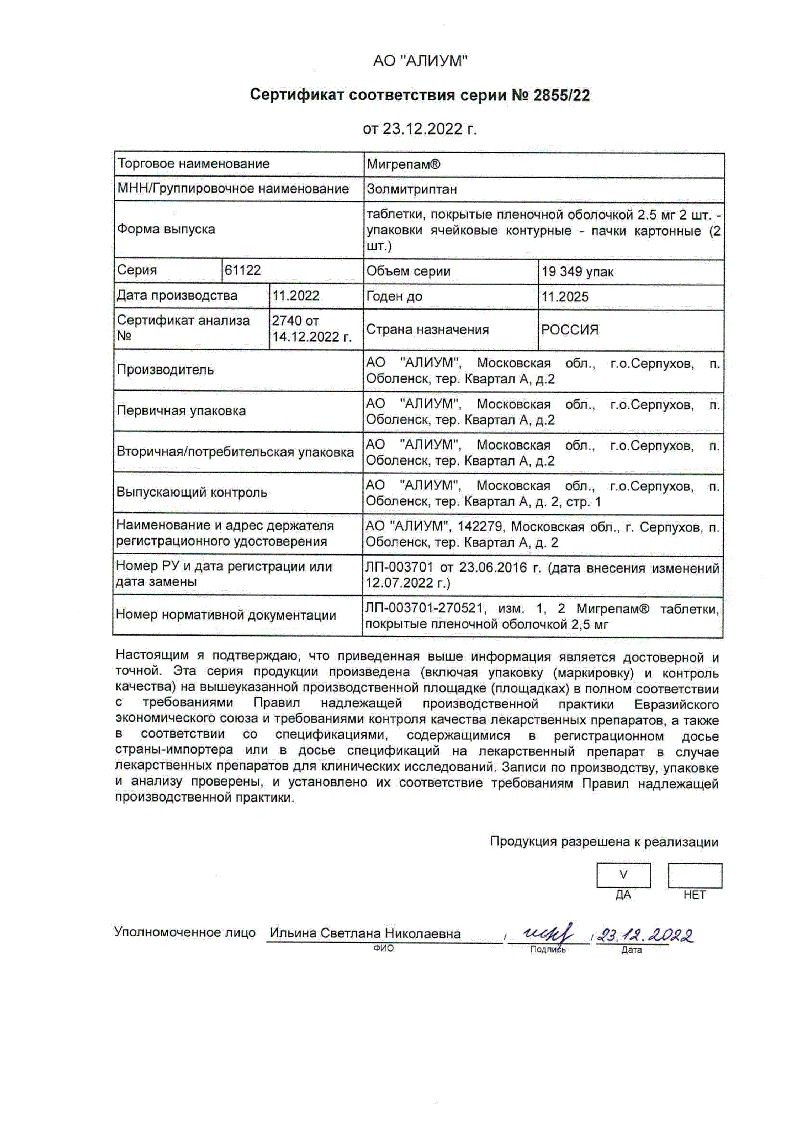 Если у пациента не был достигнут терапевтический эффект после приема препарата в дозе 2.5 мг, для снятия последующих приступов мигрени можно применять препарат Мигрепам® в дозе 5 мг (2 таб.).