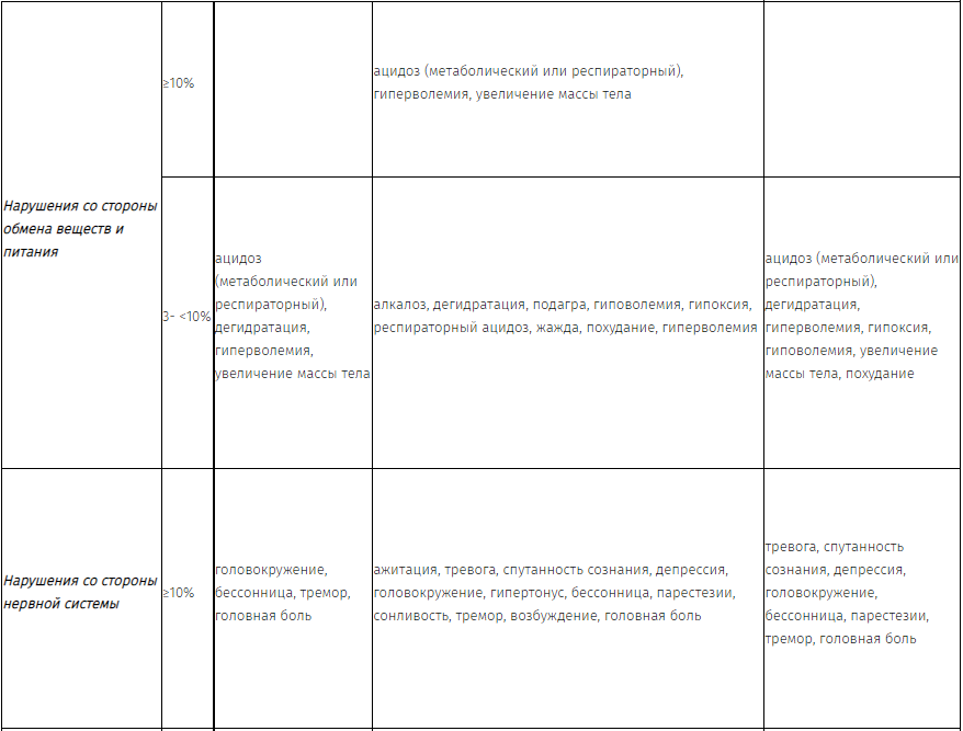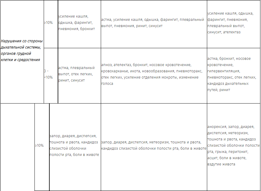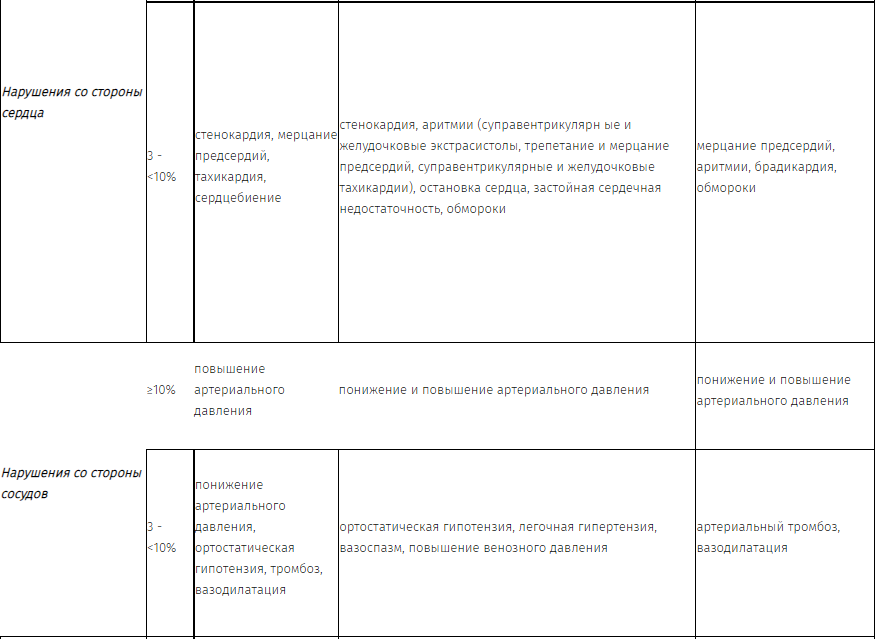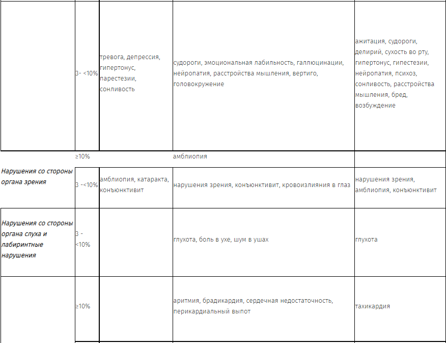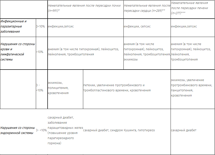 Нежелательные явления, отмеченные у ≥10% и у 3-10% больных, получавших ММФ в комбинации с циклоспорином и глюкокортикостероидами в контролируемых исследованиях по профилактике отторжения почечного трансплантата (3 исследования, данные по суточной дозе 2 и 3 мг), в контролируемом исследовании по пересадке сердца и в контролируемом исследовании по пересадке печени.