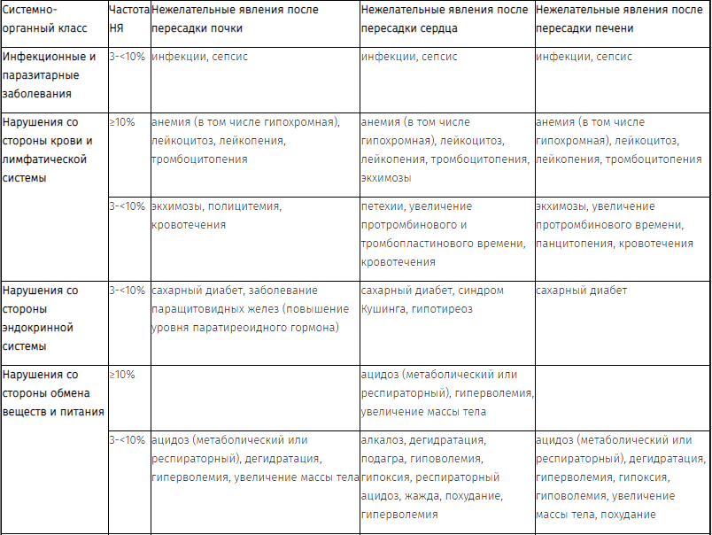 - данные по безопасности и эффективности препарата у пациентов детского возраста после пересадки сердца или печени отсутствуют.