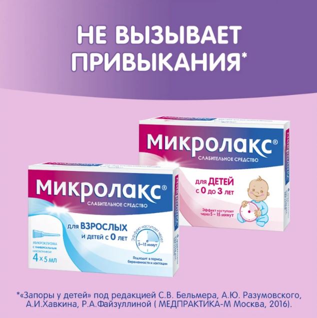 МИКРОЛАКС® - комбинированный препарат, оказывающий слабительное действие. Эффект наступает через 5-15 мин. В состав препарата входят натрия цитрат (пептизатор, который вытесняет связанную воду, содержащуюся в каловых массах), натрия лаурилсульфоацетат (разжижает содержимое кишечника) и сорбит (усиливает слабительное действие путем стимуляции поступления воды в кишечник). Увеличение количества воды за счет пептизации и разжижения способствует размягчению каловых масс и облегчает опорожнение кишечника.