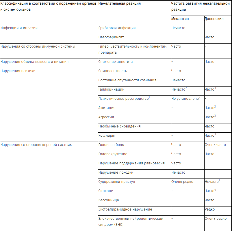 Имеются отдельные сообщения о возникновении следующих нежелательных реакций при применении мемантина в клинической практике: агранулоцитоз, лейкопения (включая нейтропению), панцитопения, тромбоцитопения, тромбоцитопеническая пурпура, острая почечная недостаточность, синдром Стивенса-Джонсона.