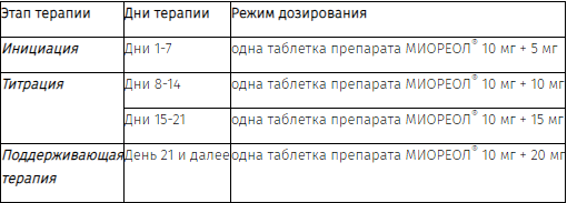 Рекомендуемая начальная доза составляет Донепезил 10 мг + Мемантин 5 мг (одна таблетка препарата МИОРЕОЛ® 10 мг + 5 мг).