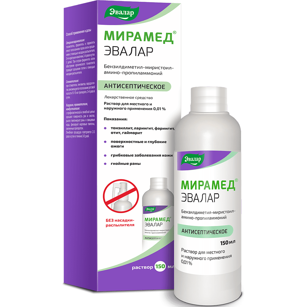 Мирамед не вызывает болезненных ощущений при проглатывании, не щиплет, не сушит и не раздражает кожу; не пачкает одежду.