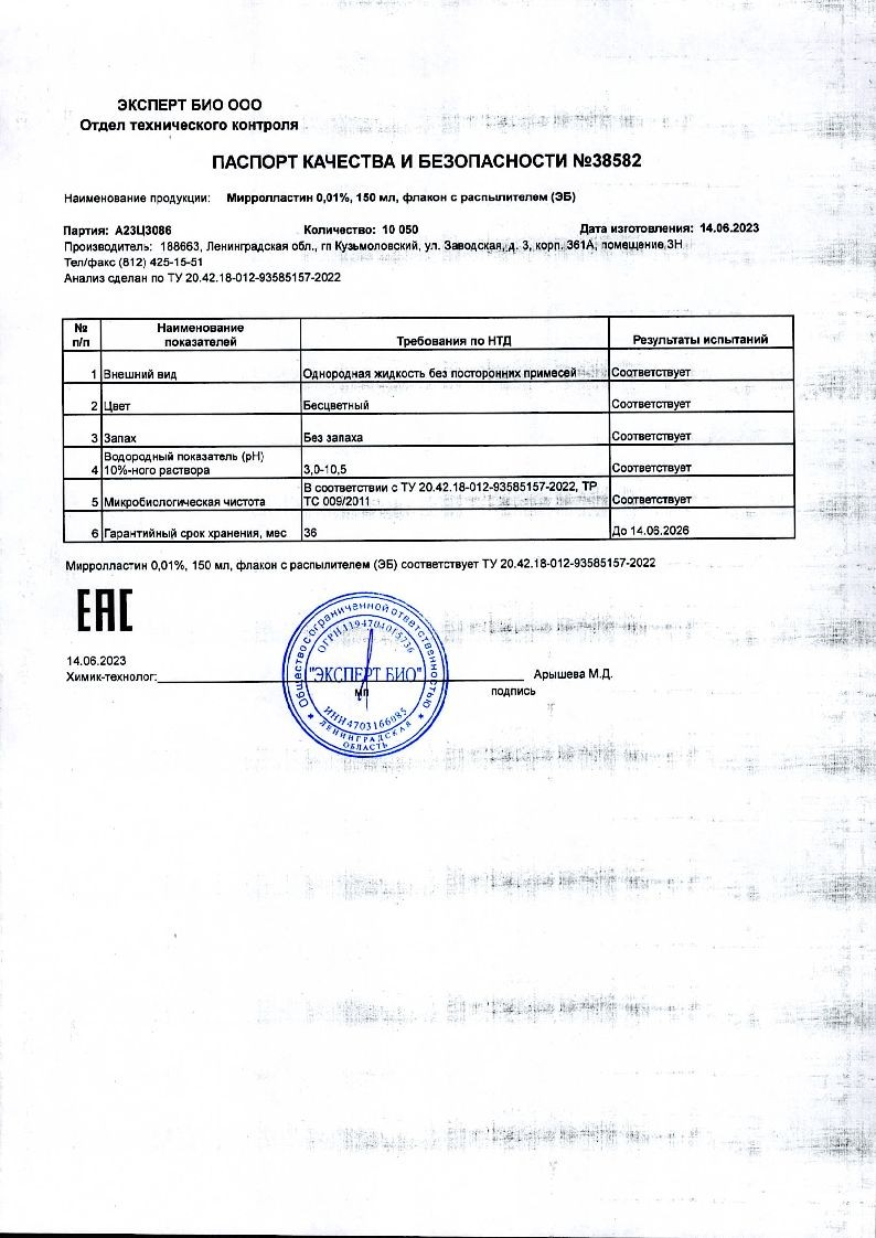 Активное вещество: бензилдиметил[3-(миристоиламино)пропил]аммоний хлорид моногидрат;