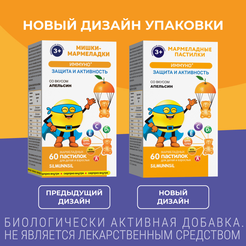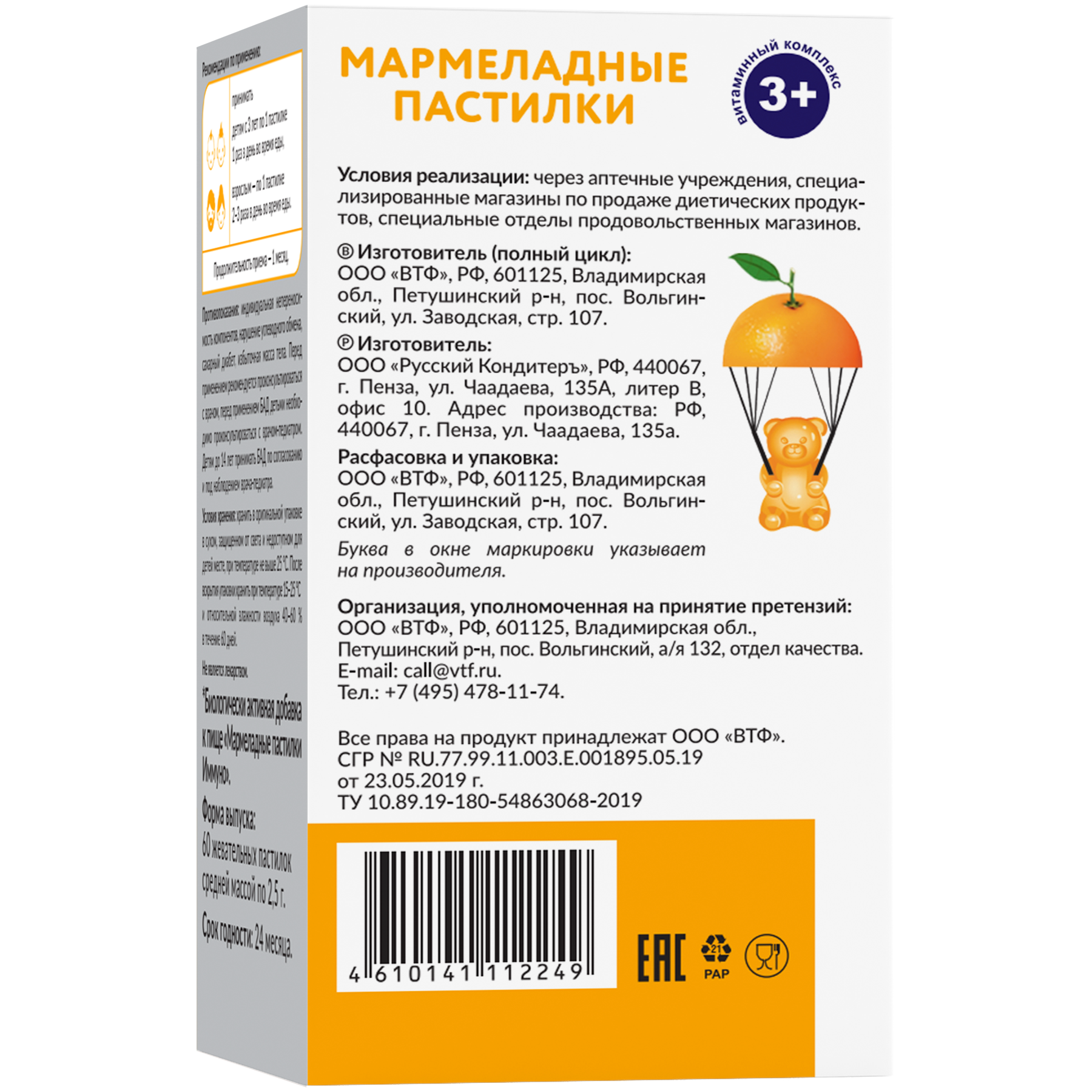 «Мармеладные пастилки Иммуно» — комплекс необходимых для укрепления защитных сил организма витаминов и минералов, многие из которых не только являются мощными антиоксидантами, но и поддерживают производство антител и лейкоцитов, синтез гормонов, способствуют нормальному росту и развитию детей.