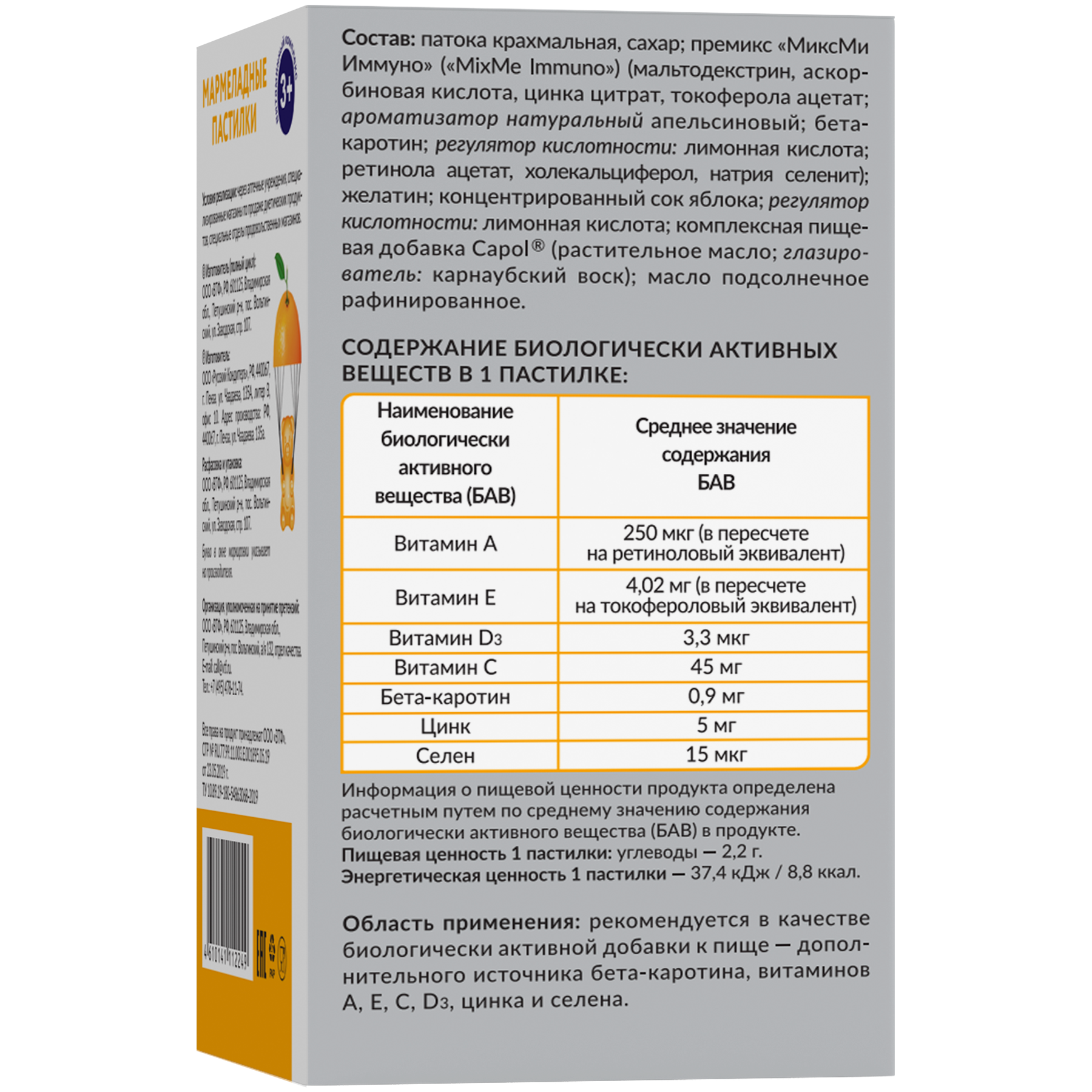 Вспомогательные вещества: патока крахмальная, сахар; премикс «МиксМи Иммуно» («MixMe Immuno») (мальтодекстрин, ароматизатор натуральный апельсиновый; регулятор кислотности: лимонная кислота; натрия селенит); желатин; концентрированный сок яблока; регулятор кислотности: лимонная кислота; комплексная пищевая добавка Capol® (растительное масло; глазирователь: карнаубский воск); масло подсолнечное рафинированное.
