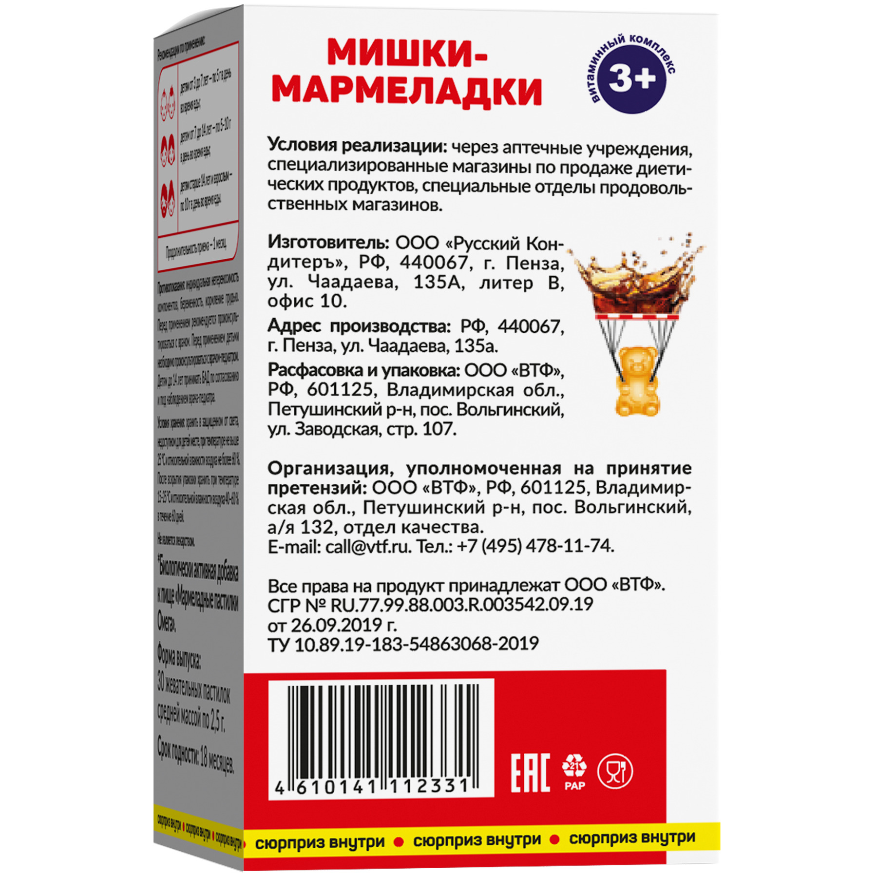 Вспомогательные вещества: патока крахмальная; сахар; желатин; носитель: мальтодекстрин; регулятор кислотности: лимонная кислота; ароматизатор натуральный «Кола» (наполнители: мальтодекстрин, гуммиарабик); концентрированный сок яблока; комплексная пищевая добавка Capol® (растительное масло; глазирователь: карнаубский воск); ниацинамид; масло подсолнечное рафинированное; краситель натуральный кармин (содержание красящих веществ 50 %; носитель: мальтодекcтрин; гидроксид натрия).