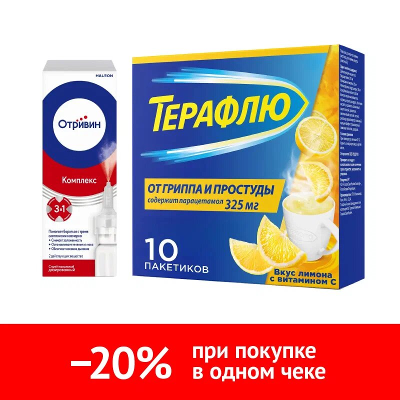Набор Терафлю 10 шт пор лимон + Отривин Комплекс 10 мл спрей (арт. S151440) купить по цене 925 ₽ в интернет аптеке в Москве и Московской области — Aptstore