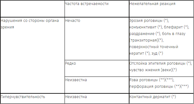 (**) При возникновении клинически значимых нежелательных реакций, таких как развитие болезней эпителия роговицы и др., необходимо прекратить лечение данным препаратом и принять соответствующие меры.