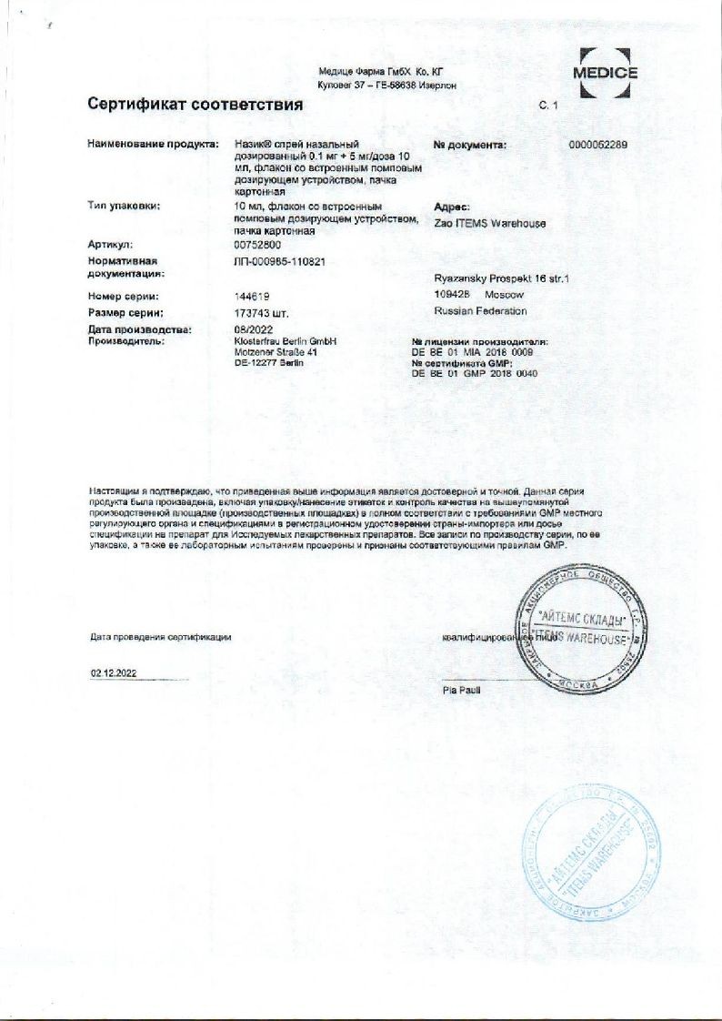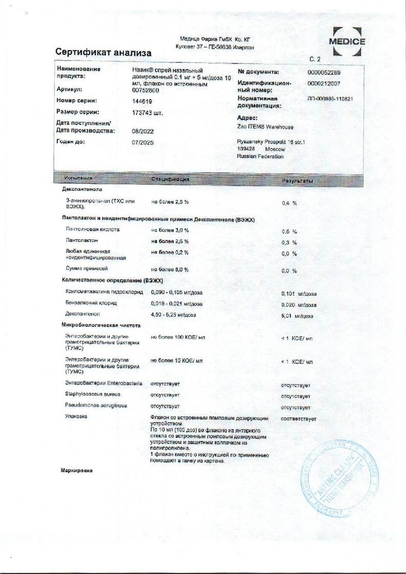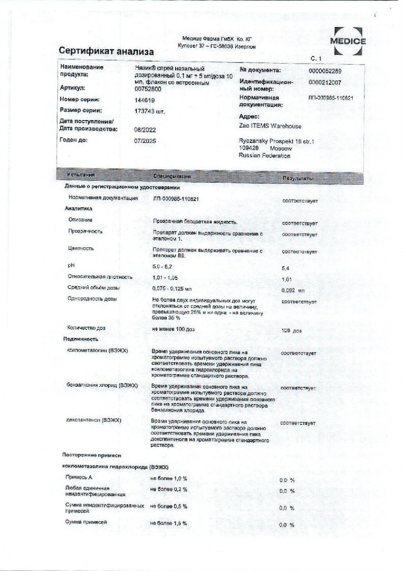 Действующие вещества: ксилометазолина гидрохлорид 0.1 мг, декспантенол 5 мг.