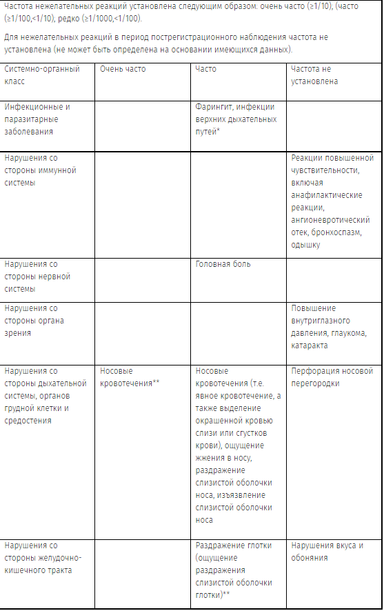 Нежелательные явления, связанные с применением препарата (≥ 1%), выявленные в ходе клинических исследований у пациентов с аллергическим ринитом или полипозом носа и в период пострегистрационного применения препарата, независимо от показания к применению, представлены в Таблице 1. Нежелательные реакции перечислены в соответствии с классификацией системно-органных классов MedDRA. В пределах каждого системно-органного класса нежелательные реакции классифицированы по частоте возникновения.
