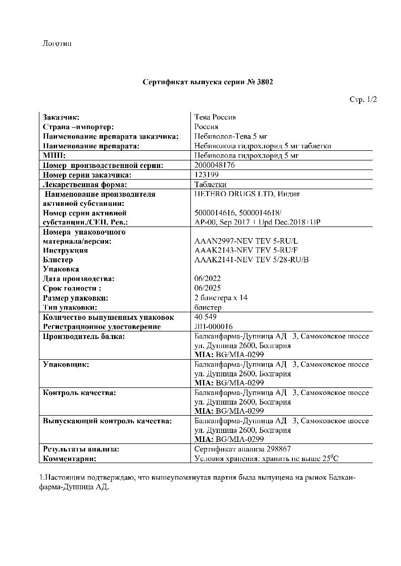 Небиволол экскретируется с грудным молоком. При необходимости приема препарата Небиволол-Тева в период лактации, грудное вскармливание необходимо прекратить.