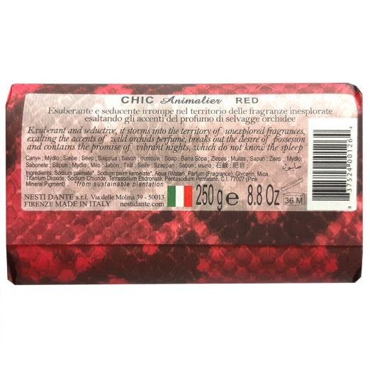Nesti Dante — экологически чистое мыло, обогащенное растительными экстрактами и маслами. Производится во Флоренции с 1947 года по старинной котловой технологии варки мыла. Настоящая роскошь — это удовольствие, которое доставляют нам давно привычные вещи. Chic Animalier (Шикарная коллекция) является подтверждением этих слов. Мыло Сhic Animalier Red (Шикарное. Розовое.) — гимн наслаждению и чувственности. Гурманский аромат наполняет пространство сладостью тиаре, красного чая и дикой орхидеи. * Перламутровое сияние мылу придает мика – природная слюда, которая окрашивается минеральными пигментами в разные оттенки.