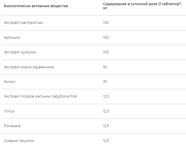 В составе препарата: экстракт расторопши, которая лучше всего восстанавливает и защищает клетки печени, нейтрализует яды, способствует нормализации метаболизма; лист артишока и куркума, которые снижают выработку холестерина, стимулируют выделение желчи; экстракт корня одуванчика обладающий выраженным желчегонным, противовоспалительным, спазмолитическим действиями; холин, способствующий усилению сжигания жиров и активизации мобилизации жирных кислот; лецитин, снабжающий организм материалом для восстановления печени и оказывающий антиоксидантное действие.