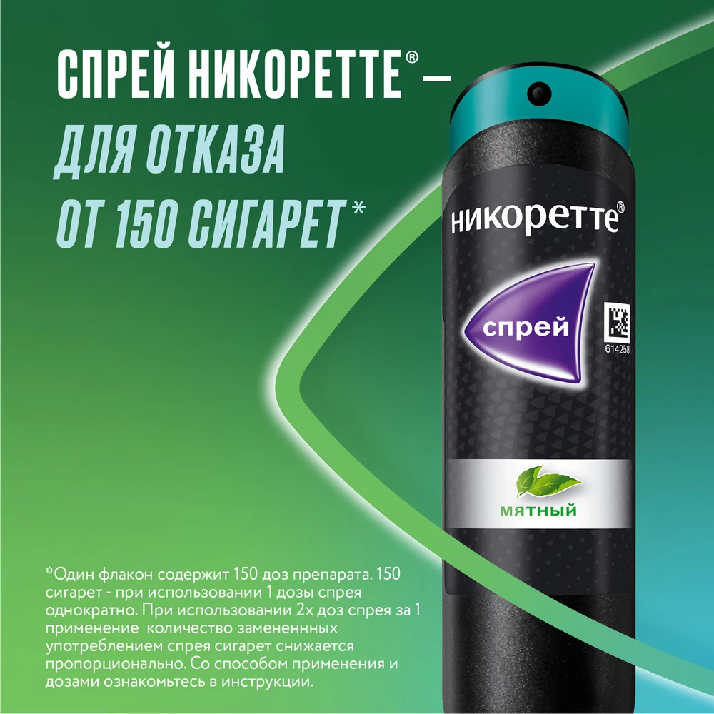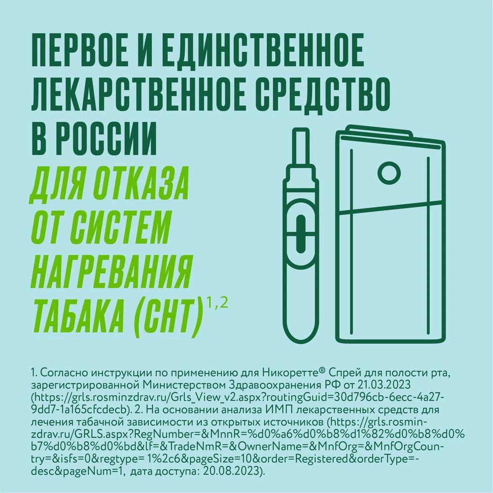 Для нанесения на слизистую оболочку полости рта. Пациент должен сделать все возможное, чтобы окончательно бросить курить при лечении спреем Никоретте®. Взрослые старше 18 лет Спрей Никоретте® следует применять в тот момент, когда возникает непреодолимое желание закурить. После подготовки спрея к использованию (см. ниже Инструкцию по использованию при первом применении спрея) поднесите наконечник спрея как можно ближе к открытому рту. Нажмите на дозатор сверху, высвободив таким образом одну дозу препарата в полость рта; следует избегать попадания спрея на губы. Чтобы исключить попадание вещества в дыхательные пути, в момент нажатия на дозатор не следует совершать вдох. Для достижения наилучших результатов не сглатывайте слюну в течение нескольких секунд после впрыскивания. Во время использования спрея прием пищи и жидкости не рекомендуется. При появлении симптомов передозировки (см. раздел «Передозировка») применение препарата необходимо немедленно прекратить. Полный отказ от курения Спрей Никоретте® следует использовать во всех случаях возникновения тяги к курению или для недопущения тяги в ситуациях, которые могут ее провоцировать. Курильщики, желающие или способные отказаться от курения немедленно, должны сразу заменить выкуривание сигарет спреем Никоретте® и, как только представится возможность, снизить количество впрыскиваний до их полного прекращения. При полном отказе от курения сделайте 1 или 2 впрыскивания в период времени, когда обычно вы выкуривали сигарету, а также в случае появления тяги к курению. Если после однократного впрыскивания тяга к курению в течение нескольких минут не снижается, следует произвести второе впрыскивание. Если требуются две дозы, то последующее применение спрея может состоять из 2 последовательных впрыскиваний. Каждый час разрешается принимать не более 4 дозированных впрыскиваний спрея. Не следует впрыскивать более 2 доз спрея одномоментно или применять более 64 доз в течение суток (или 4 дозы в час в течение 16 часов). Каждый флакон содержит не менее 150 доз. Средний курс применения спрея в указанной дозе – 6 недель. Затем следует начать снижение количества впрыскиваний таким образом, чтобы к концу 9-й недели количество доз составляло половину от среднего количества доз в сутки, получаемых в первые 6 недель, а в течение 12-й недели – не более 4 доз в сутки. Когда суточная доза снизится до 2–4 впрыскиваний, применение спрея следует прекратить. После окончания терапии для предотвращения возврата к курению пациенты могут применять спрей Никоретте® при непреодолимом желании курить. В таких ситуациях можно сделать 1 впрыскивание, а в случае, если после однократного впрыскивания тяга к курению в течение нескольких минут не снижается, следует произвести второе впрыскивание. При этом не следует превышать 4 дозированных впрыскиваний в сутки. Регулярное применение спрея более 6 месяцев обычно не рекомендуется, однако некоторым пациентам может потребоваться более длительная терапия, чтобы не возобновить курение. Сокращение количества выкуриваемых сигарет Курильщикам, желающим снизить количество выкуриваемых сигарет, следует применять спрей по потребности между эпизодами курения в целях увеличения промежутков времени между курением и с целью как можно большего снижения курения. Как 