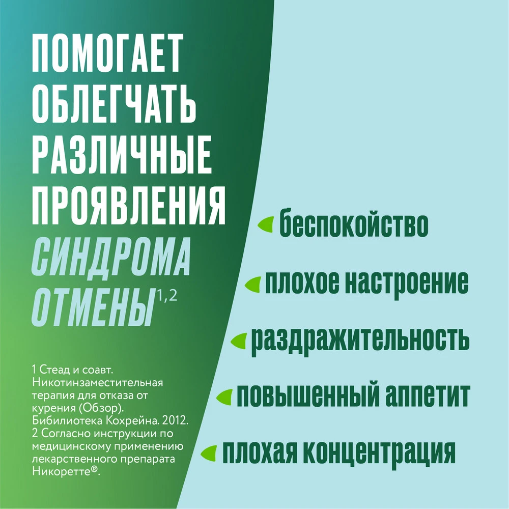 Никоретте® - широкая линейка препаратов никотинзаместительной терапии для отказа от курения. Никоретте® помогает снижать тягу к курению и облегчать различные проявления синдрома отмены. Постепенное снижение дозировки препарата помогает организму вырабатывать привычку жить без никотина, способствуя лечению табачной зависимости. Безопасность и эффективность никотинзаместительной терапии изучалась в 150 клинических исследованиях (1) и рекомендована Всемирной Организацией Здравоохранения как средство лечения табачной зависимости (2)