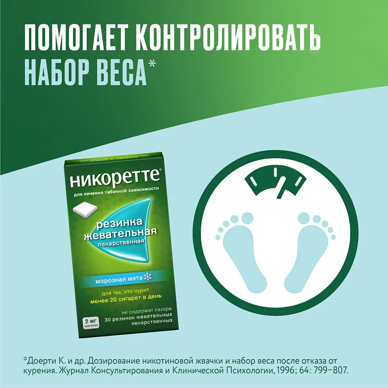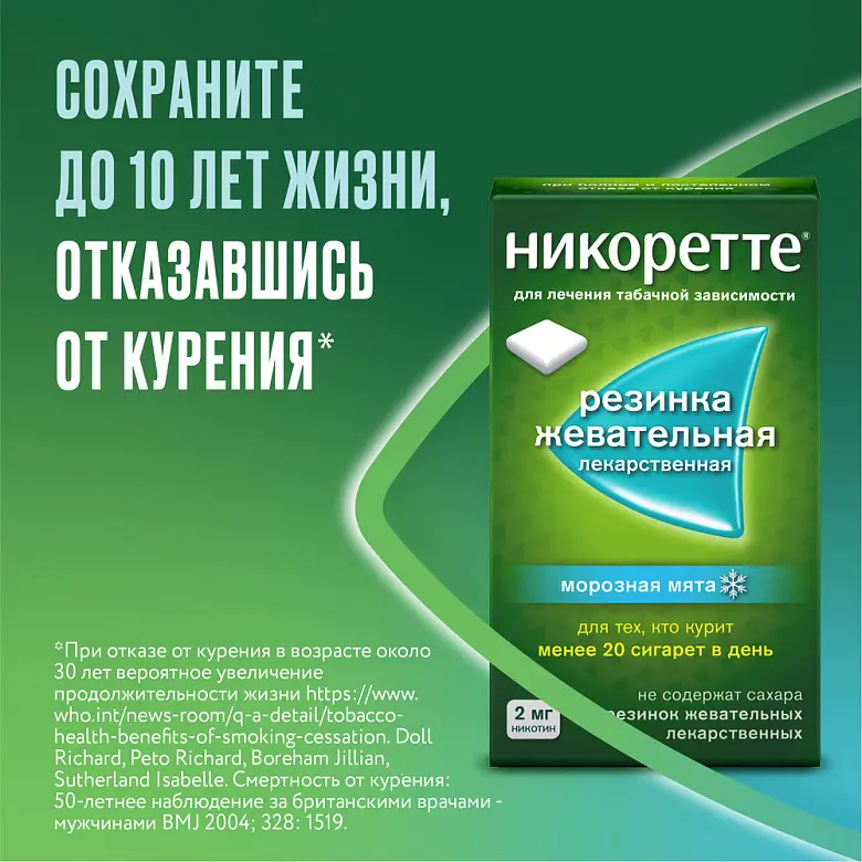 Сокращение количества выкуриваемых сигарет Жевательную резинку следует применять по потребности между эпизодами курения в целях увеличения промежутков времени между курением и с целью как можно большего снижения курения. Если в течение 6 недель не удалось добиться снижения суточного потребления сигарет, следует обратиться за помощью к специалисту. Попытку бросить курить следует предпринять, как только Вы почувствуете, что готовы к этому, но не позднее, чем через 6 месяцев после начала терапии. Если Вы не смогли предпринять серьезную попытку отказаться от курения в течение 9 месяцев после начала терапии, следует обратиться к специалисту. После отказа от курения следует соблюдать рекомендации терапии, постепенного снижения дозы и отмены препарата, указанные выше при полном отказе от курения. Регулярное применение жевательной резинки в течение более 12 месяцев обычно не рекомендуется. Однако, некоторым бывшим курильщикам может потребоваться более длительное лечение с помощью жевательной резинки для предотвращения возврата к курению или прежнему уровню потребления табака. Одновременное проведение медицинского консультирования и обеспечение психологической поддержки обычно повышают эффективность терапии.